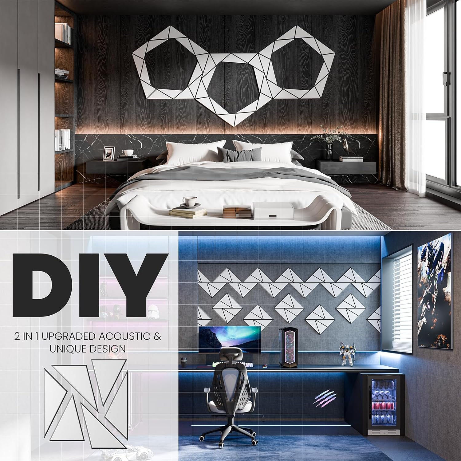 - 【Perfect for wall decoration】Be different from other acoustic panels,We have not only upgraded their acoustic performance,but aslo their appearance.Adopt beveled edge and multi-line design.They can be DIY into pinwheel patterns and multi-ring patterns.They absorb unnecessary sound while playing a good role in decorating the wall.Perfect for professional studios, video blogger,game room, podcasting, school,home theaters,offices,etc