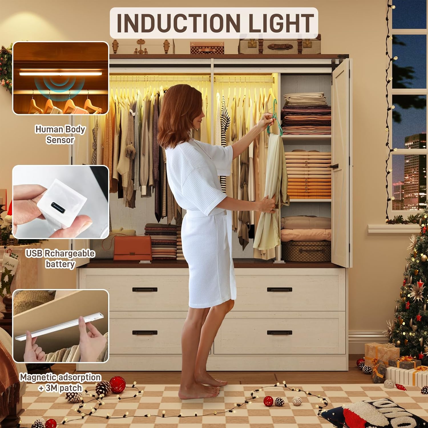 - 4 Door Wardrobe Closet with Motion Sensor Light: Our led wooden wardrobe closet come with induction light which will turn on automatically when you get within 120° and 16 feet, allows you to choose your clothes conveniently whether at night or low light environment.The light could be chargeable by usb cable which included in package. Auto/On/Off 3 modes available for different occasions which more bang for your buck than other closet.