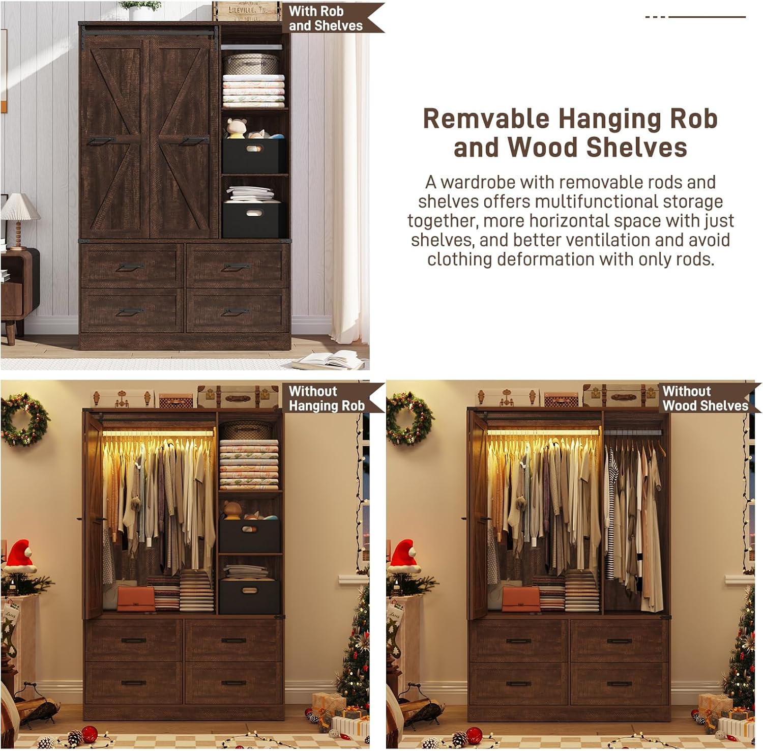 Farmhouse 3 Doors Armoire Wardrobe Closet w/Folding Sliding Barn Door and Lights, LED Armoire Closet w/Drawers for Bedroom, Freestanding Wooden Wardrobe Storage Closets w/Hanging Rod,Rustic Brown