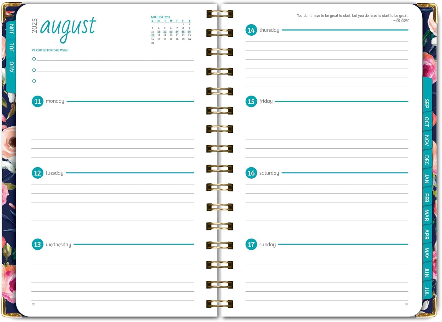 - 2 Page Monthly Spreads followed by 2 Page Weekly Spreads