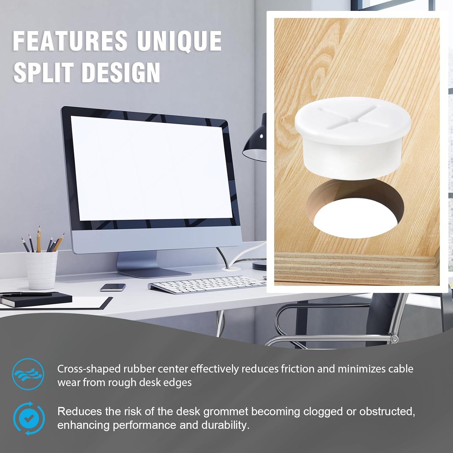 - UPGRADED CABLE MANAGEMENT -- The unique cross-shaped rubber center effectively reduces friction, and minimizes cable wear from rough desk edges. Cables pass through smoothly without damage, and the flexible opening ensures a snug fit for multiple cables while keeping your workspace tidy.