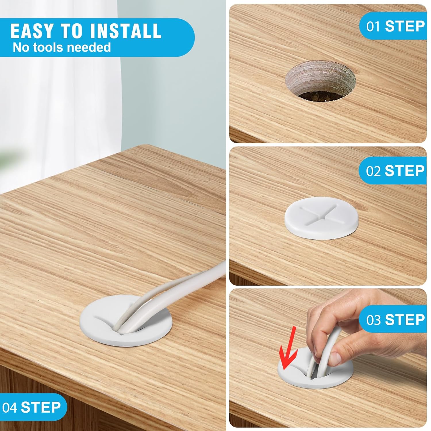 - DELIGHTS PACKAGE -- Your package includes 20 x 25mm desk grommets. Useful Tips: ① Make sure the hole's edges are smooth and free of splinters that could damage your cables or the grommet, ② Place the grommet into the hole. It should fit snugly, ③ Finally, route your cables through the desk grommet.