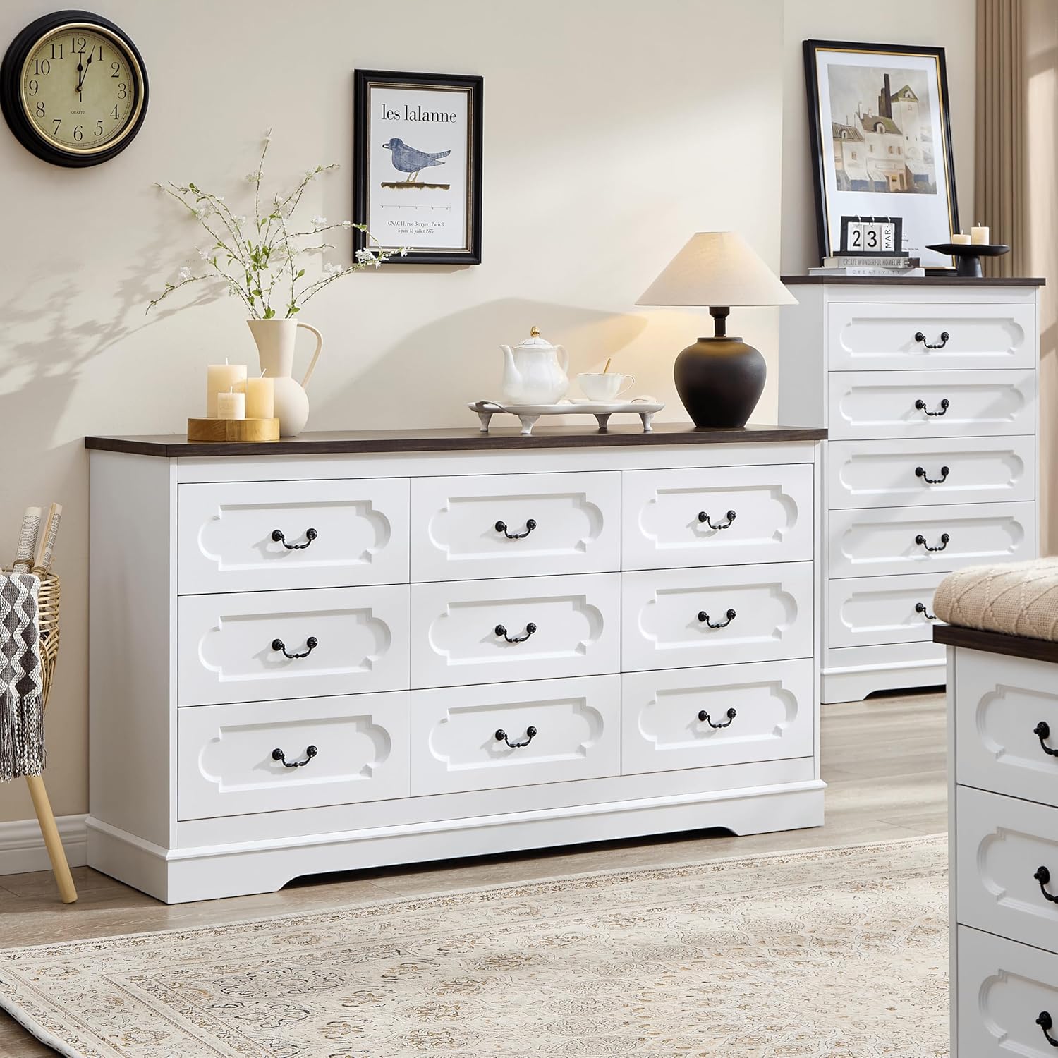 LIDYUK 9 Drawer Dresser for Bedroom Farmhouse WhiteTall Wood Chest of Drawers for Bedroom Dresser, Modern Rustic 59" Wide Drawers Dressers Wooden Closet and Storage Cabinet, Hallway, Living Room