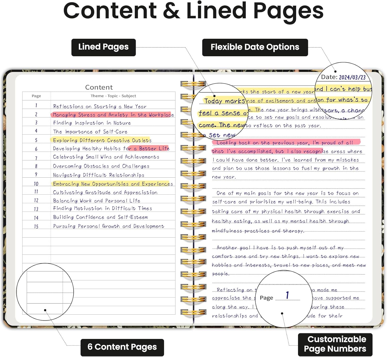 - Structured College-Ruled Pages: Featuring 7mm college-ruled lines, this journal notebook helps keep your writing organized and legible. The evenly spaced lines are perfect for structured notes, work lists, or detailed writing, making it an excellent choice for school students, professionals, and writers alike. It also includes 6 content pages, perfect for creating an index for easy reference.