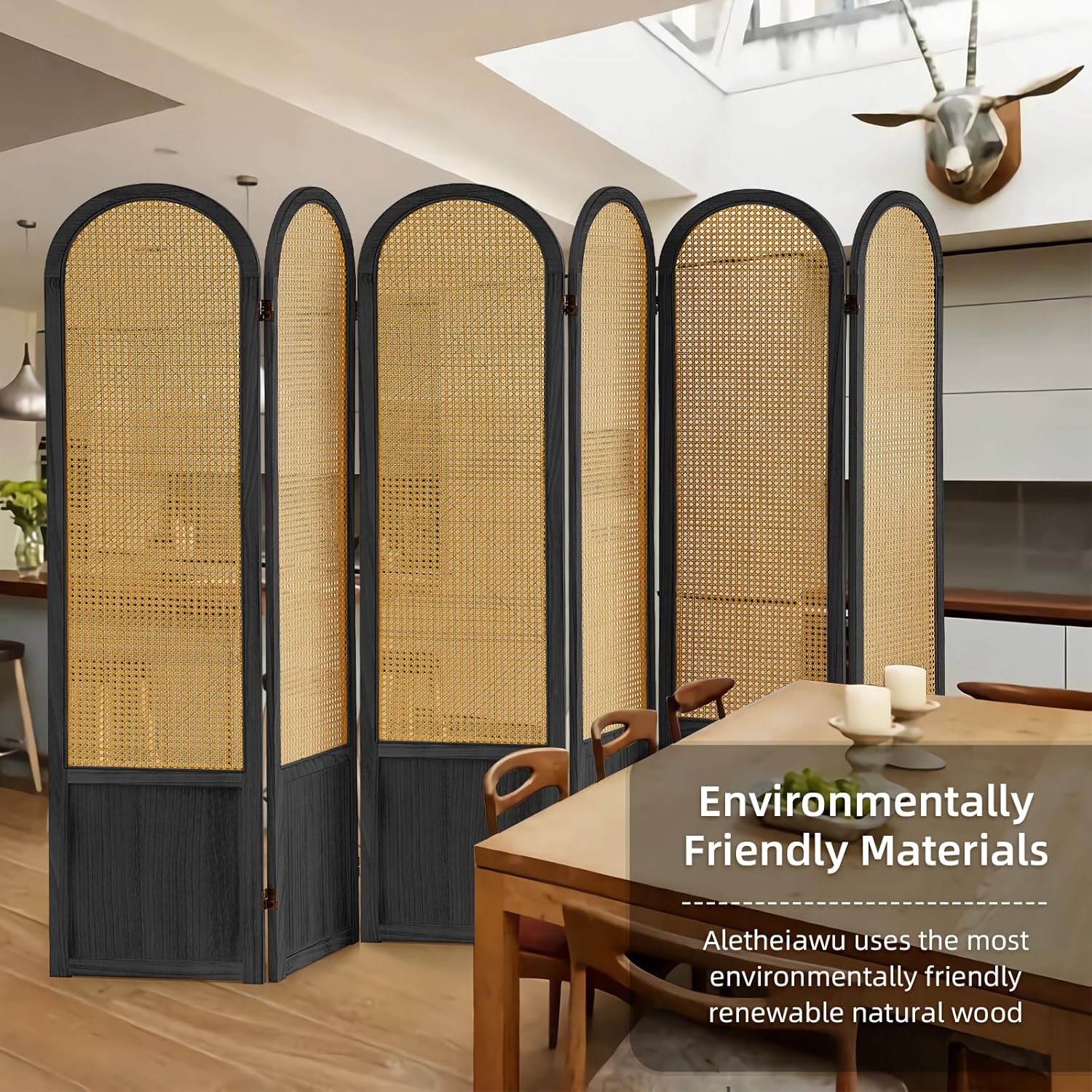 - Freestanding Folding Privacy Screen: Each panel of Aletheiawu rattan room divider screen is 15.7 inches wide, and each panel is connected by 2 two-way metal hinges. The room divider panels can be folded in any direction according to your preference, and the shape can be adjusted to your needs. The wooden privacy screen wall divider for room separation is easy to store and takes up only a small space when fully folded