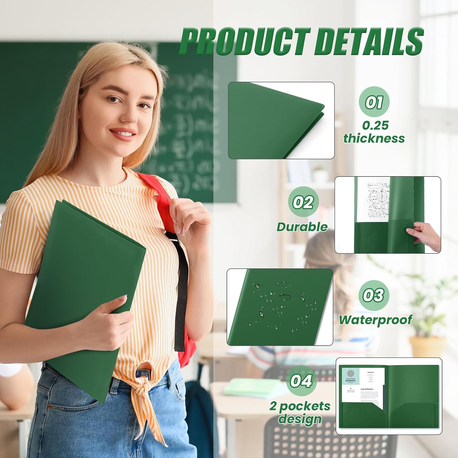 Gueevin 24 Pcs Plastic Folders with Pockets, Back to School Two Pocket Folder Fit Letter Size, Heavy Duty School Business Card Holder for Home Office, 11. 61 x 9. 45 Inches (Dark Green)