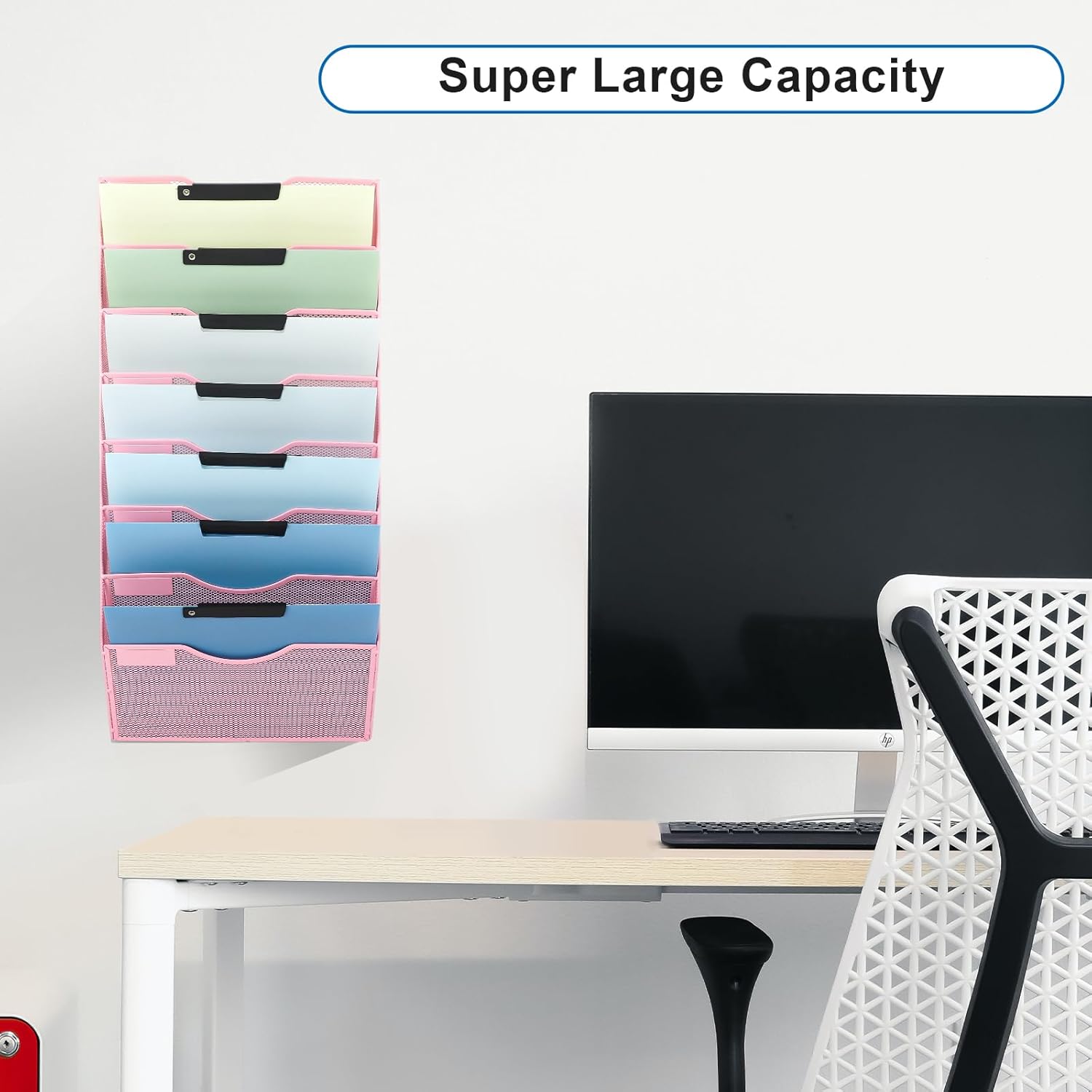 EASEPRES 8 Pocket Mesh Hanging Wall File Organizer, Wall Mounted Mail Paper Document Folder Holder, Clipboard Storage Organization Magazine Rack with Nametag Label for Office Home School, Pink