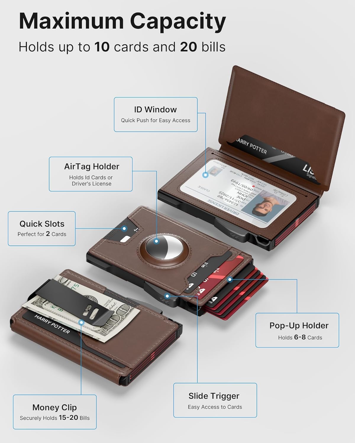 - 【LARGE CAPACITY】 With 8 card slots, 1 ID window, and metal clip, this wallet has plenty of room for all your essentials. It can hold up to 13 cards and 20 bills, so you can carry everything you need without feeling weighed down.