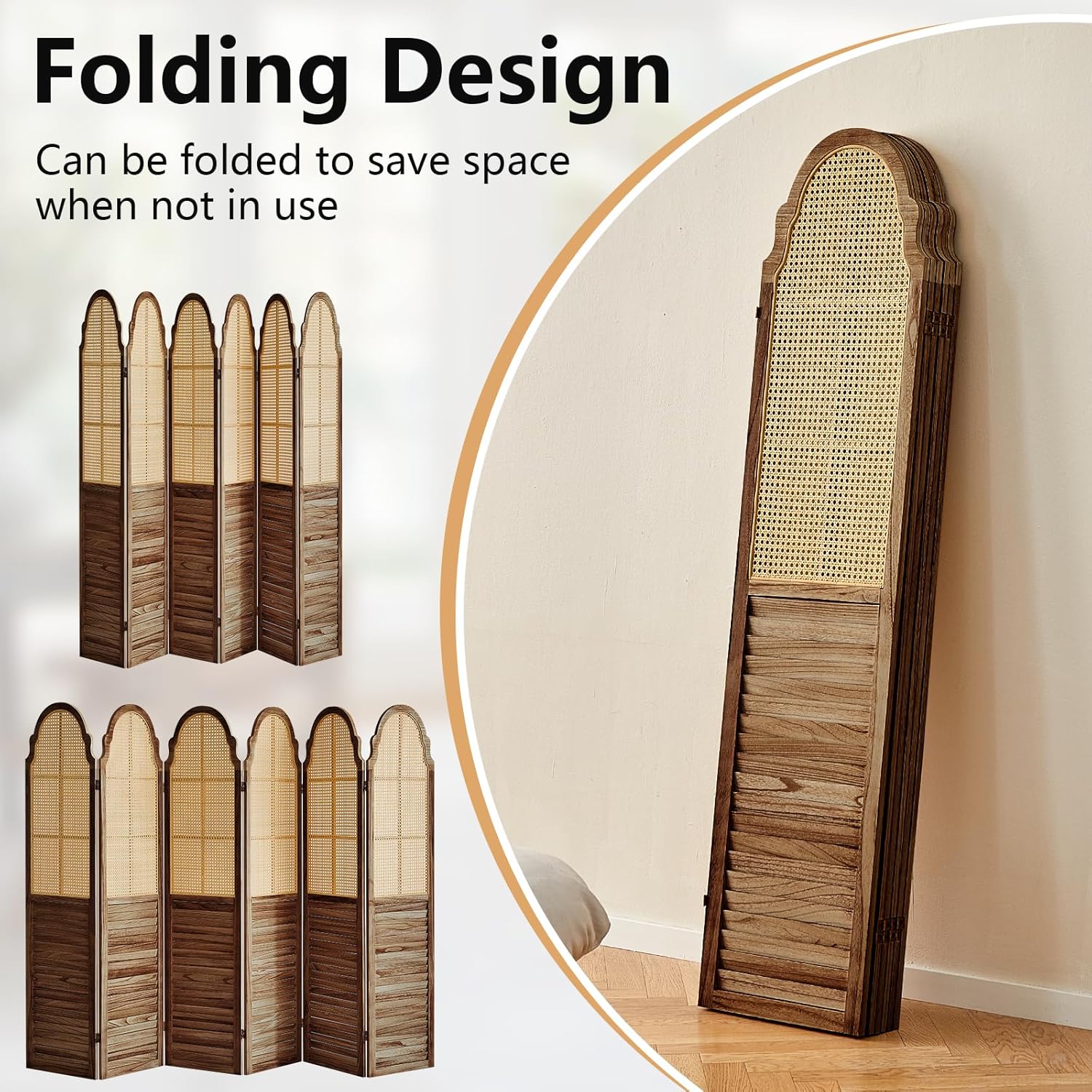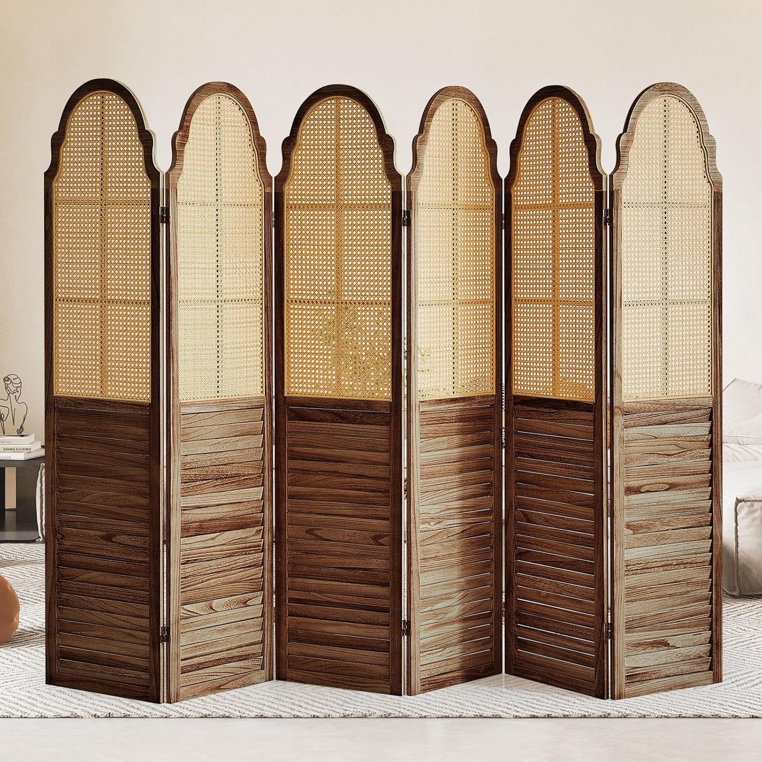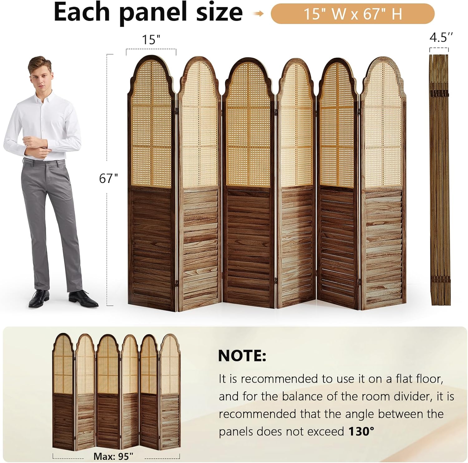 6 Panel Rattan Room Divider Panel, 5.6Ft Partitions and Dividers, Louvered Partition Divider, Room Dividers Screen, Solid Wood Frame, Folding Screen, Bedroom, Family Room, Dark Brown