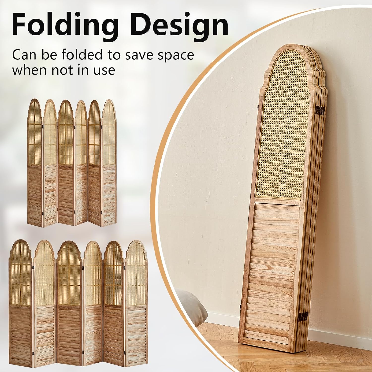 6 Panel Rattan Room Divider Panel, 5.6Ft Partitionsand Dividers, Louvered Partition Divider, Room Dividers Screen, Solid Wood Frame, Folding Screen, Bedroom, Family Room, Light Brown