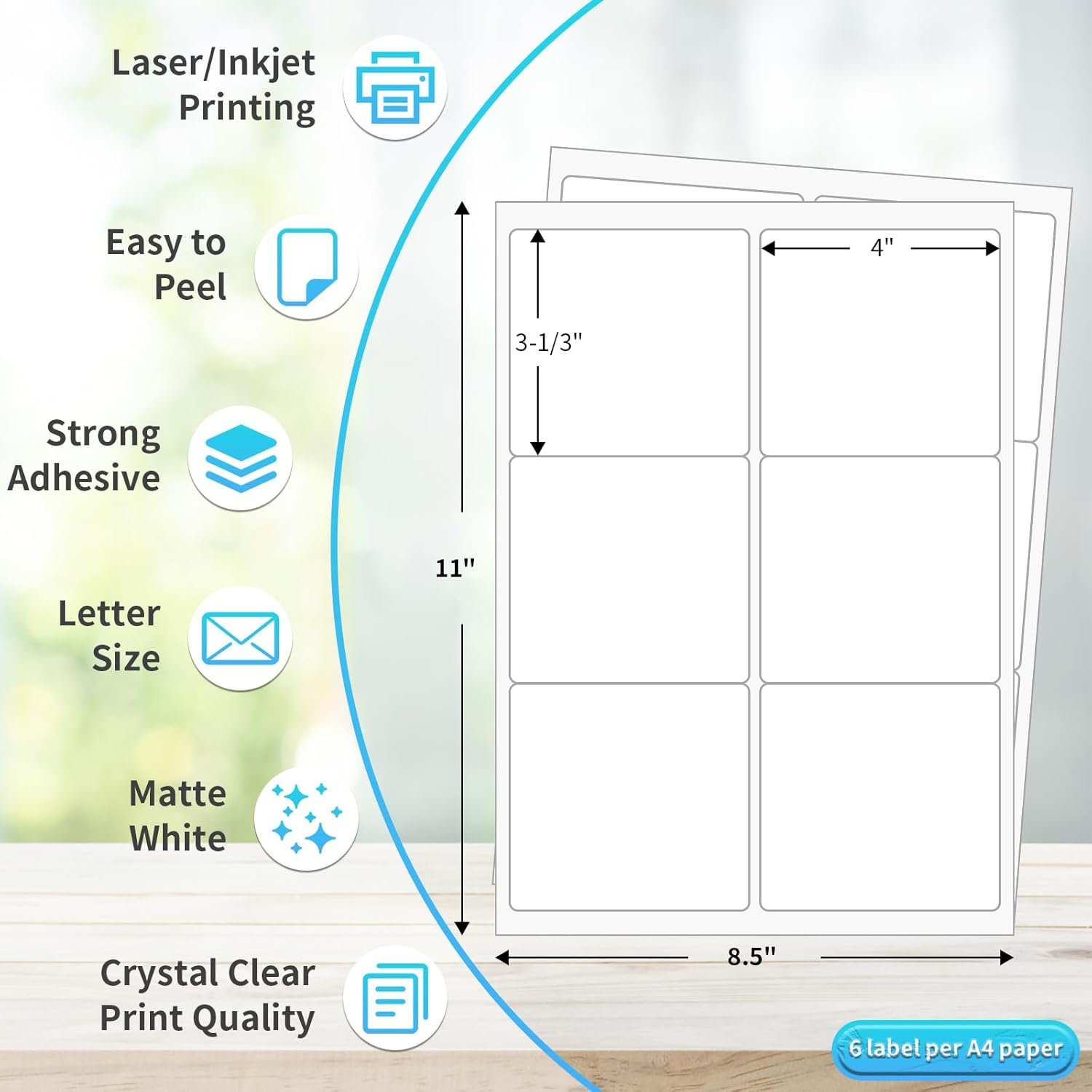 - 【Specification】Label size: 3-1/3" x 4". Sheet size: 8.5" x 11" (US Letter Size). 6 labels per sheet, total 30 sheets = 180 labels