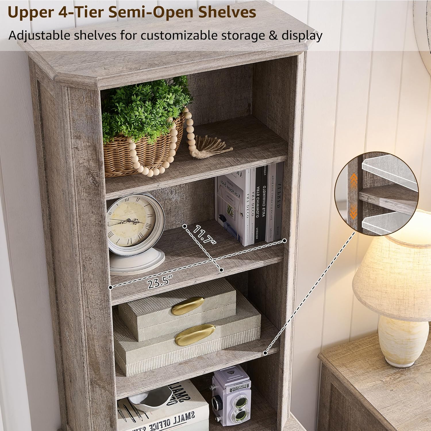 - 4 Adjustable Open Shelves:This wooden book shelf with door features four adjustable semi-open shelves, each with three height settings (up or down 2.5”), allowing you to customize shelf spacing between 7.2”-14.7” to fit books, trophies, decorative items, and frequently accessed items. bringing a touch of warmth and farmhouse style to your space