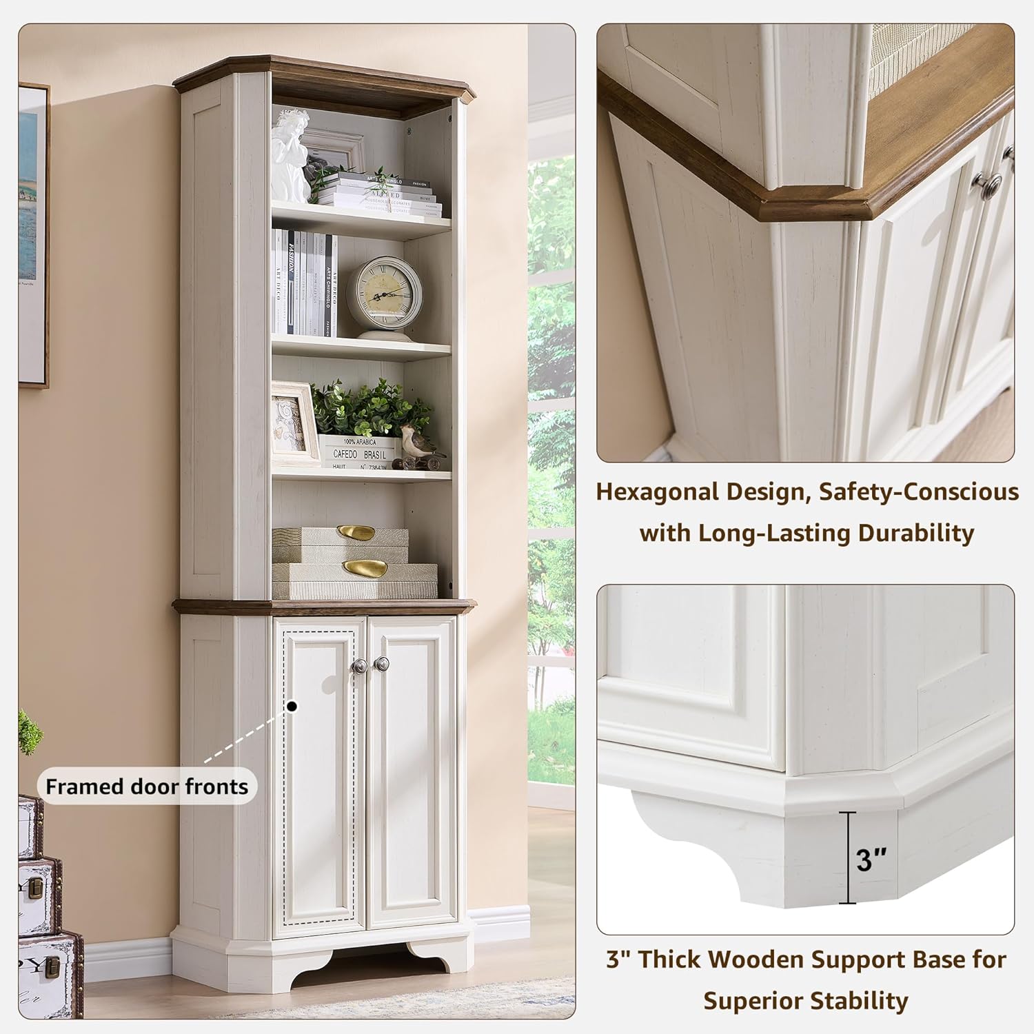 - Elegant & Sturdy 6-Tier Farmhouse Bookshelf with Farmhouse Charm: Upgrade your home office or living space with this 6-tier wood bookshelf, measuring 23.5”W x 11.7”D x 72”H. Designed to double as both a bookcase and a storage cabinet, it blends Victorian-style elegance with modern durability. The framed door fronts, hand-polished vintage mushroom knob, and a natural wood grain finish create a refined yet rustic aesthetic, enhancing any office or home décor
