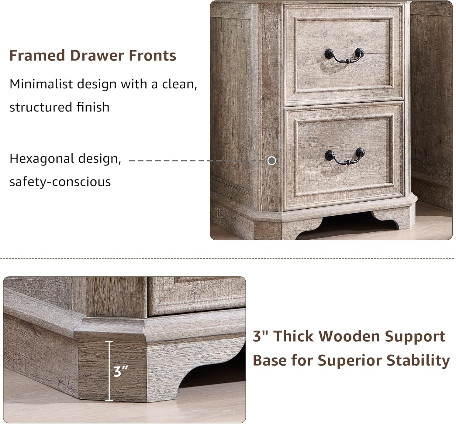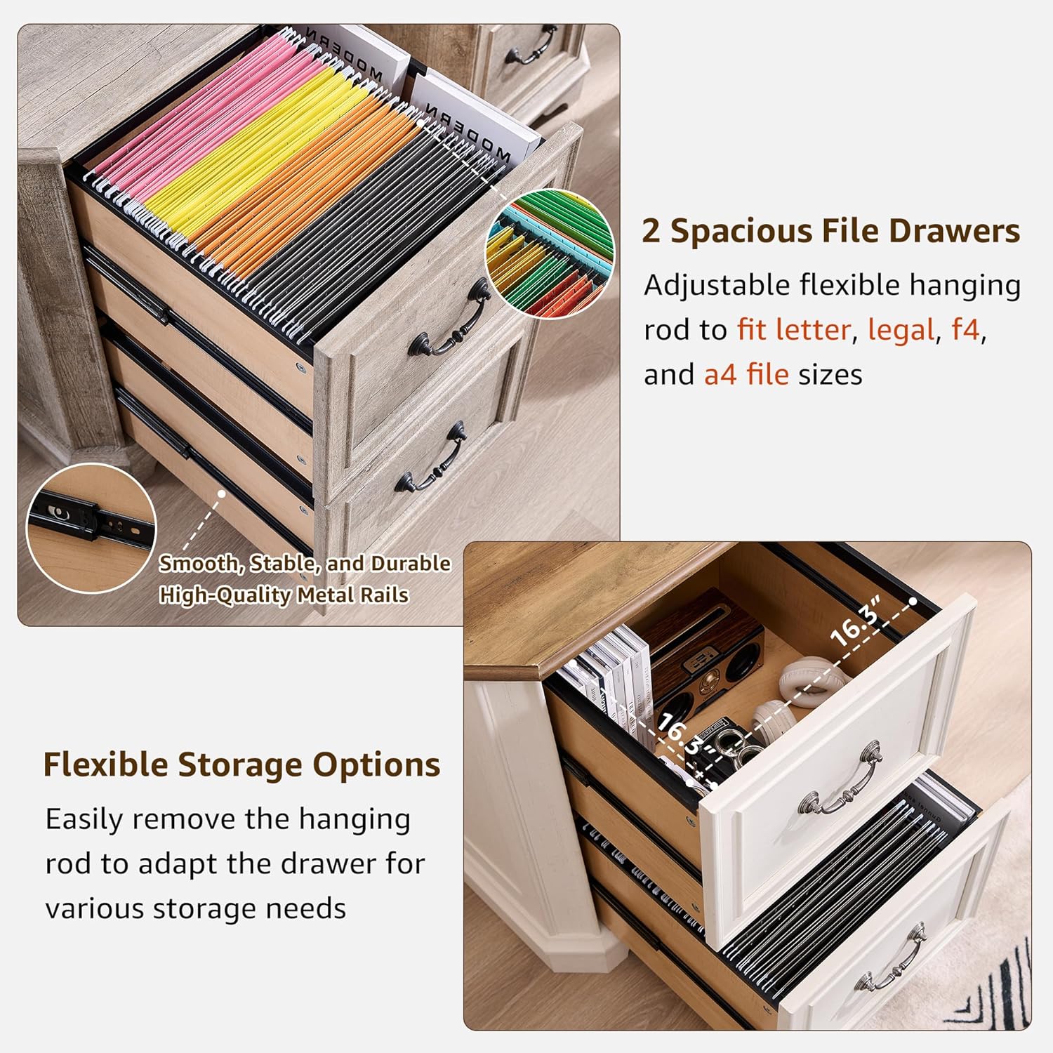 - 2 Spacious Drawers with Flexible Hanging Rods: The two large file drawers (16.3"L x 16.3"W x 10.2"D) include removable hanging rods, allowing you to organize Letter, Legal, A4, and F4 file sizes. Need extra storage? Simply remove the rods to transform the drawers into versatile compartments for clothing, accessories, or seasonal items. Smooth metal drawer slides ensure effortless opening and closing, while the interlock safety system prevents both drawers from opening simultaneously