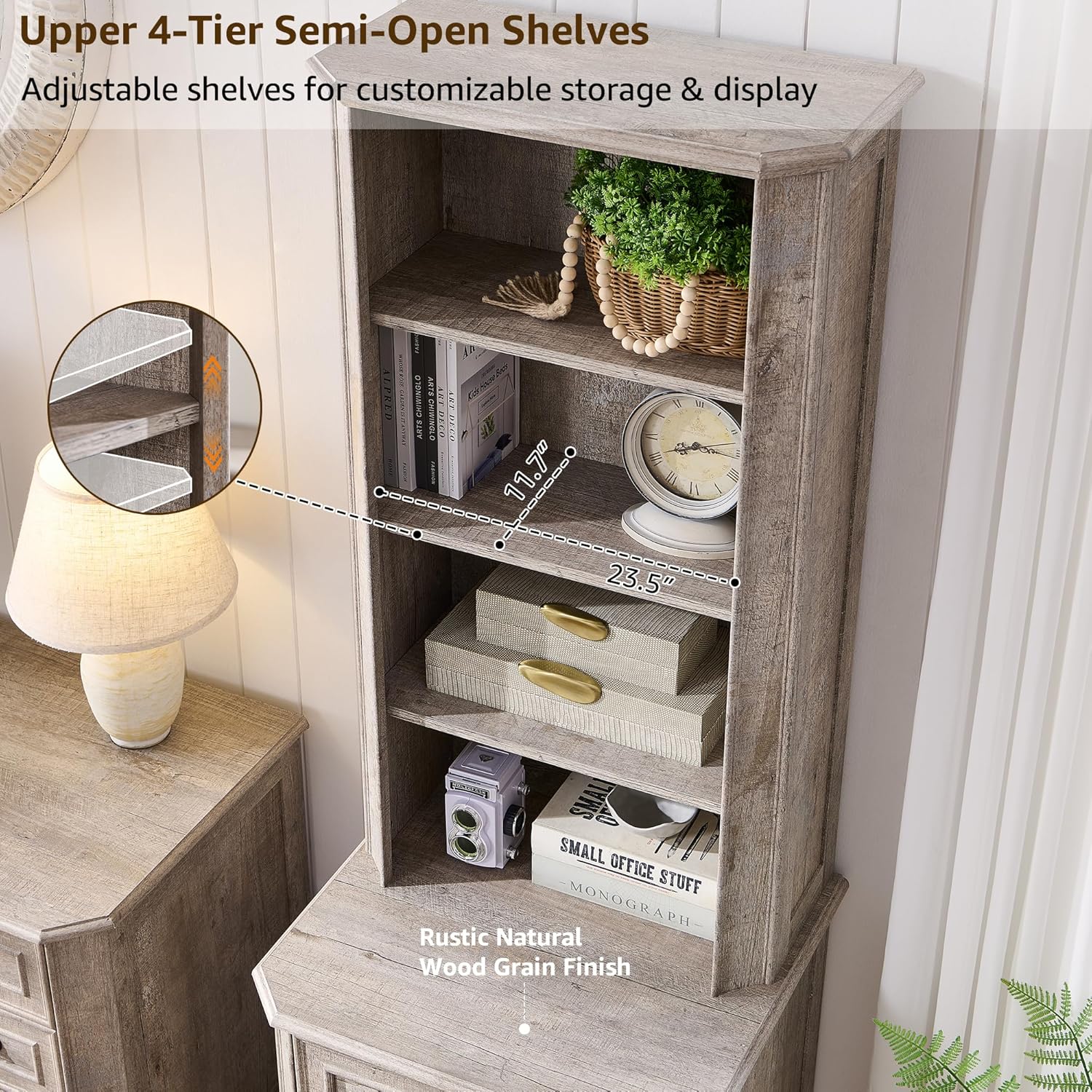 - 4 Adjustable Open Shelves & Spacious Display Surface: This wooden bookshelf with storage features four adjustable semi-open shelves, each with three height settings (up or down 2.5"), allowing you to customize shelf spacing between 7.2”-14.7” to fit books, trophies, decorative items, and frequently accessed items. The 23.5-inch wide tabletop expands your display area while bringing a touch of warmth and farmhouse style to your space
