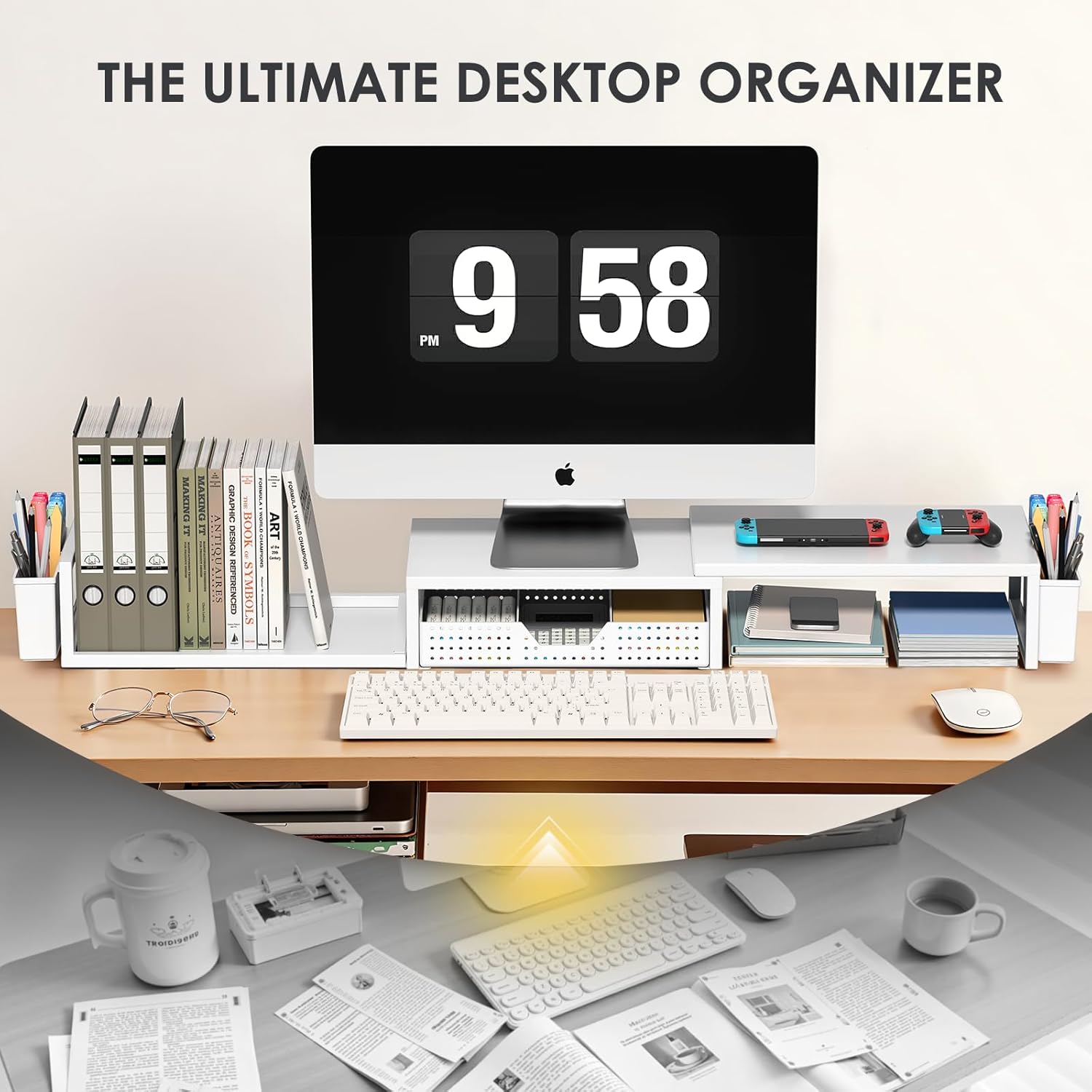 - 【Unlock Extra Space】Raise your monitor height with this monitor riser to free up space underneath. Store your keyboard, mouse, files, printer, gaming items, etc. neatly. Fits perfectly in any home, office, or dorm. Maximize desktop space and master desk organization