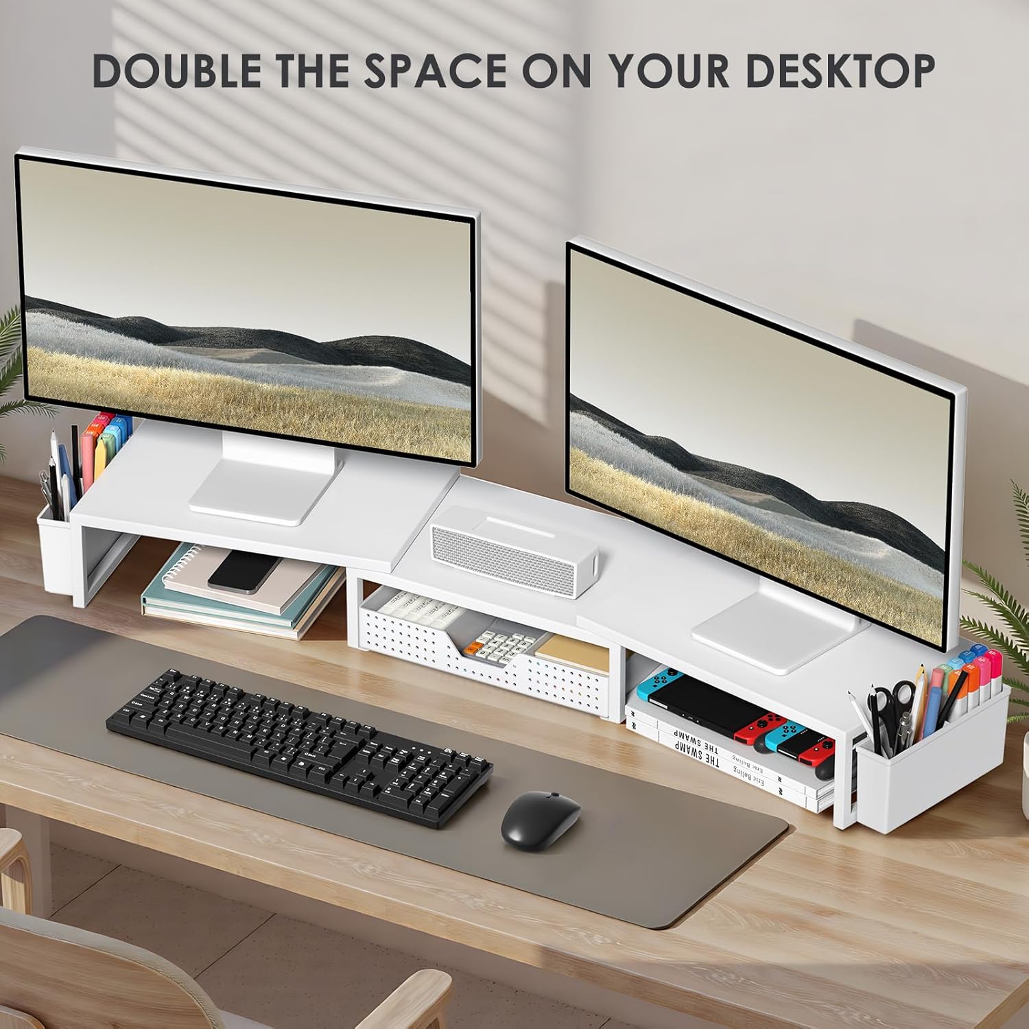 - 【 Dual Monitor Stand with Smart Storage】Clear workspace clutter effortlessly. Organize desk accessories & office supplies in handy 2 hanging pen holders and a drawer. Keep essentials visible and instantly accessible for better focus and efficiency