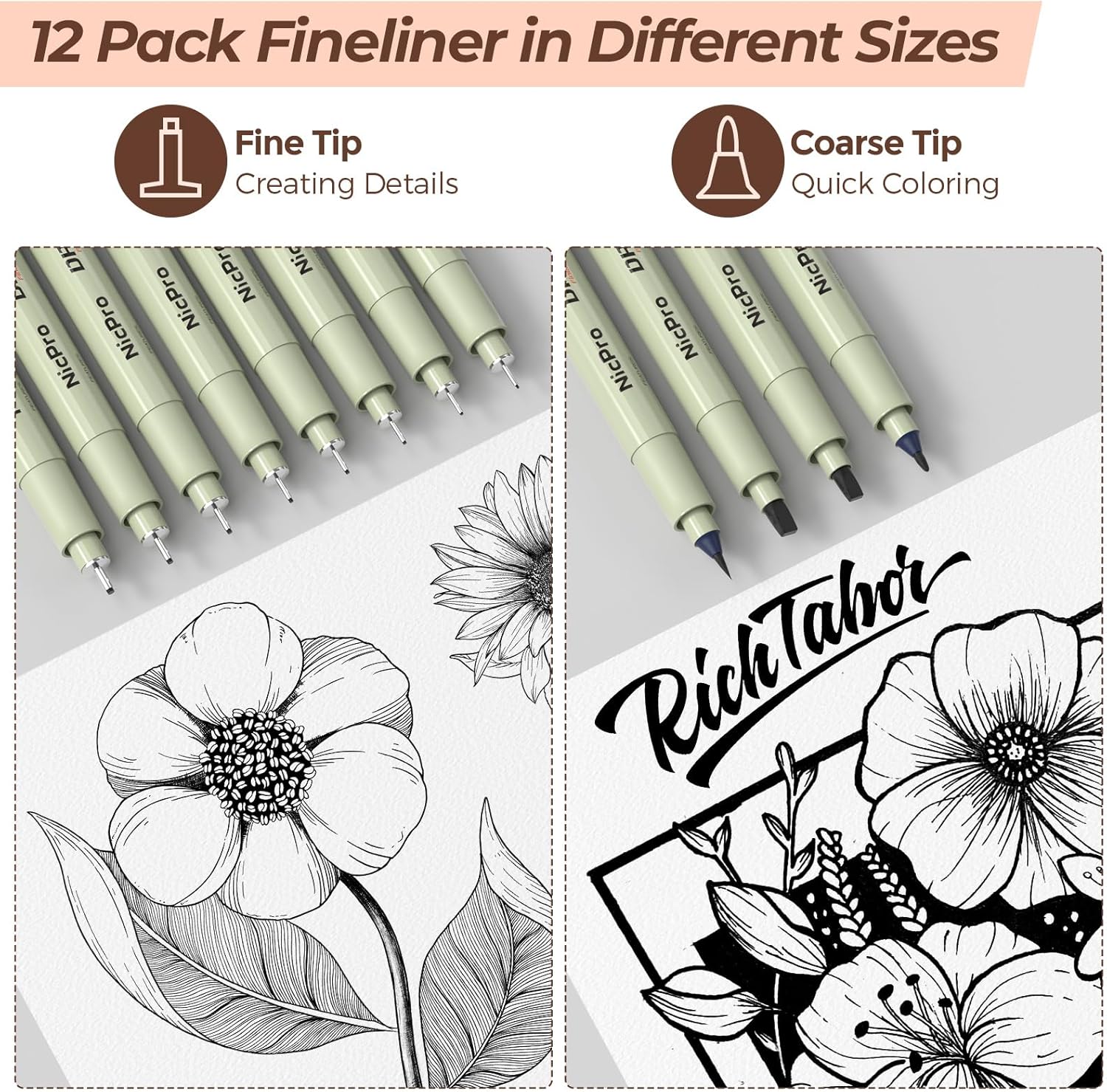 - 12 Micron Pen – Waterproof & No Bleed: Features 12 tip sizes: 005 to 3.0mm + Brush (BR) tip. Great for outlining, fine detailing, manga, and calligraphy. Archival ink won’t bleed or smear—perfect for artists, illustrators, architects, and journaling enthusiasts