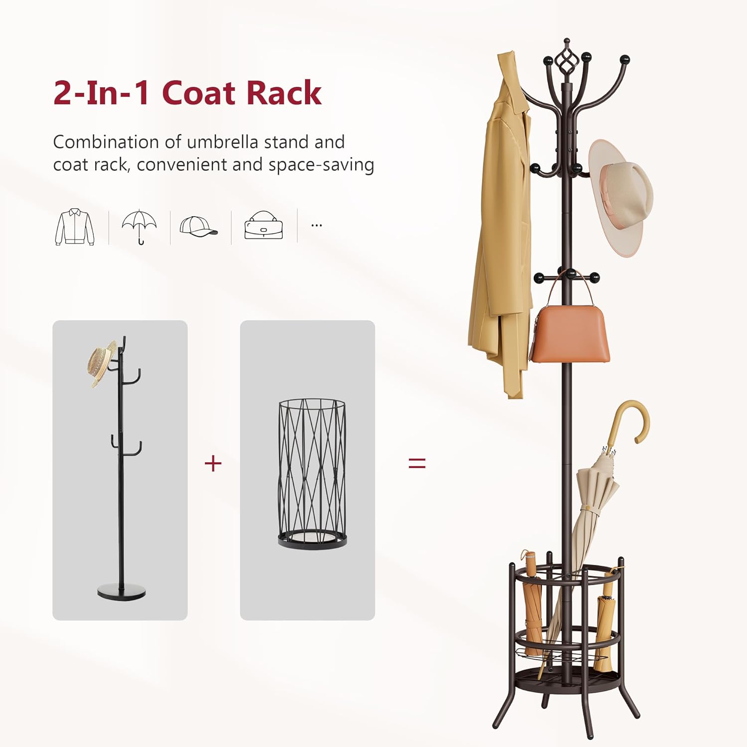 - 【2-in-1 Design】This versatile coat rack freestanding features 16 hooks and an umbrella holder, optimizing vertical space. Perfect for homes or outdoor use, it stands independently at the entrance for easy storage of coats, bags, hats, or umbrellas.