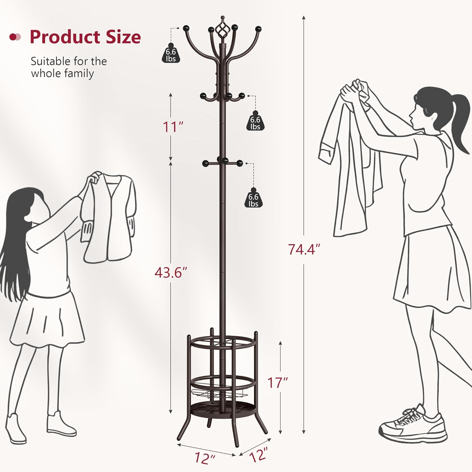 - 【Durable & Stable】Built with a thickened metal rod and reinforced base, this coat rack stand stays sturdy even under heavy loads (up to 30 kg/66 lbs), offering long-lasting reliability.