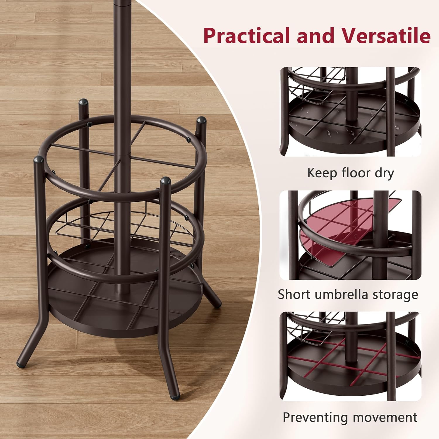 - 【Practical Umbrella Holder】The freestanding coat rack includes a dual-function umbrella holder: the umbrella holder can hold long umbrellas, and there are 4 hooks and a basket for short umbrellas. The base tray with a grid design catches water, protects floors, and keeps umbrellas secure.