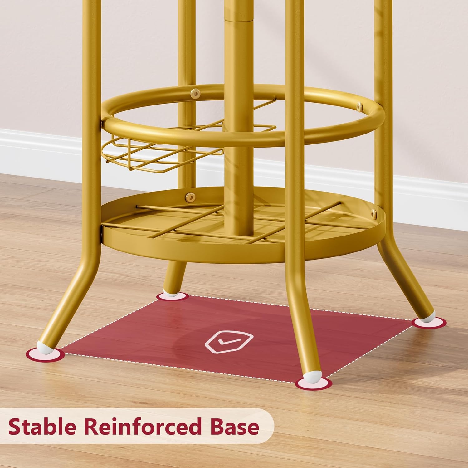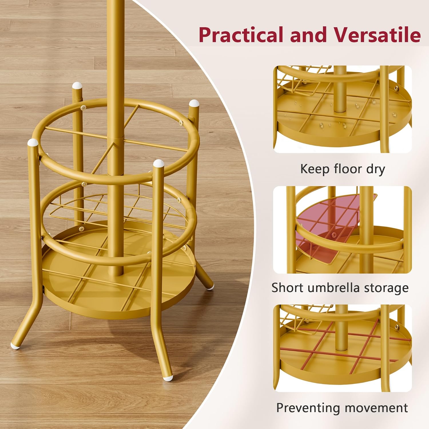Tajsoon Coat Tree with Umbrella Holder, Coat Rack Freestanding, Coat Hangers Stand with 16 Hooks, Standing Coat Rack for Living Room, Bedroom, Office, Gold