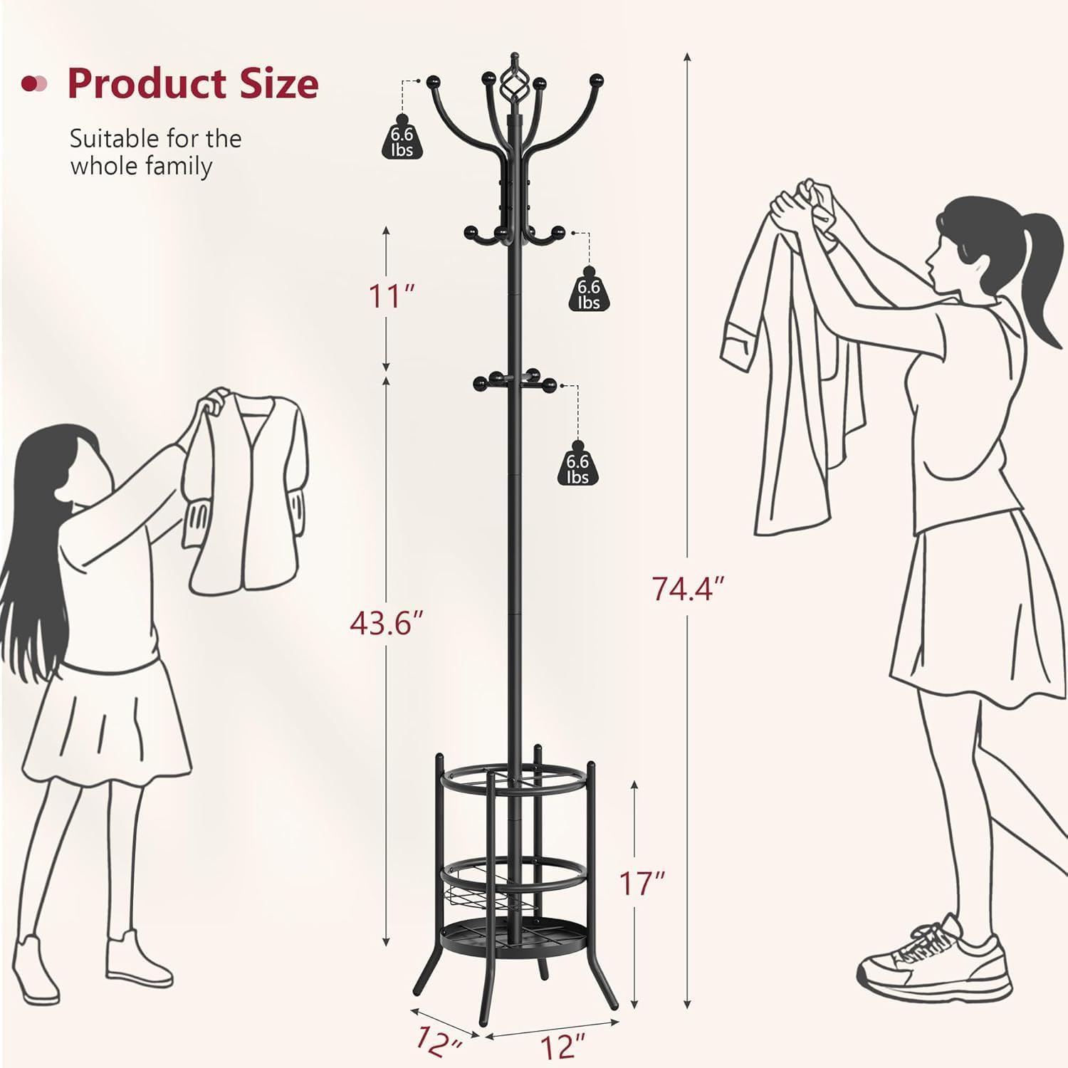 - 【2-in-1 Design】This versatile coat rack freestanding features 16 hooks and an umbrella holder, optimizing vertical space. Perfect for homes or outdoor use, it stands independently at the entrance for easy storage of coats, bags, hats, or umbrellas.