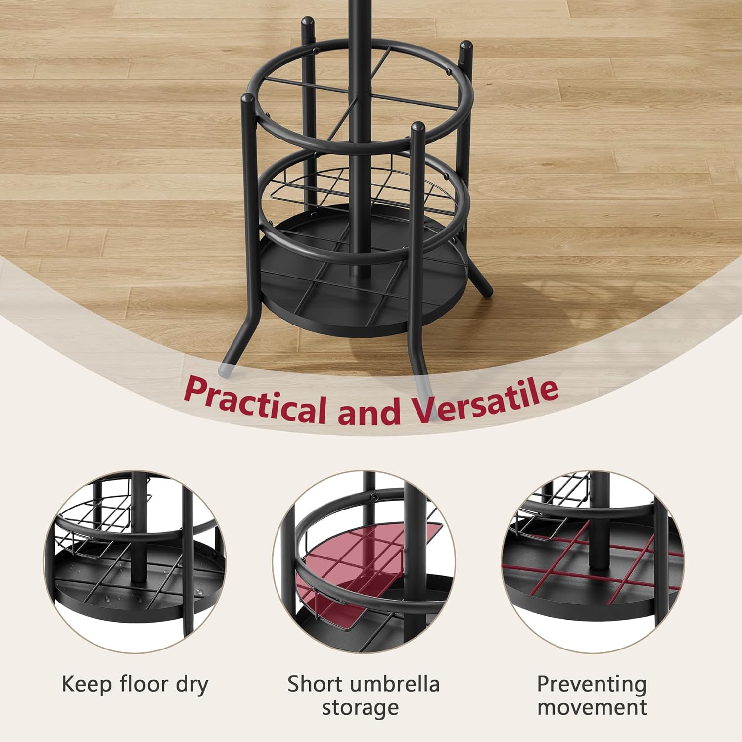 - 【Practical Umbrella Holder】The freestanding coat rack includes a dual-function umbrella holder: the umbrella holder can hold long umbrellas, and there are 4 hooks and a basket for short umbrellas. The base tray with a grid design catches water, protects floors, and keeps umbrellas secure.