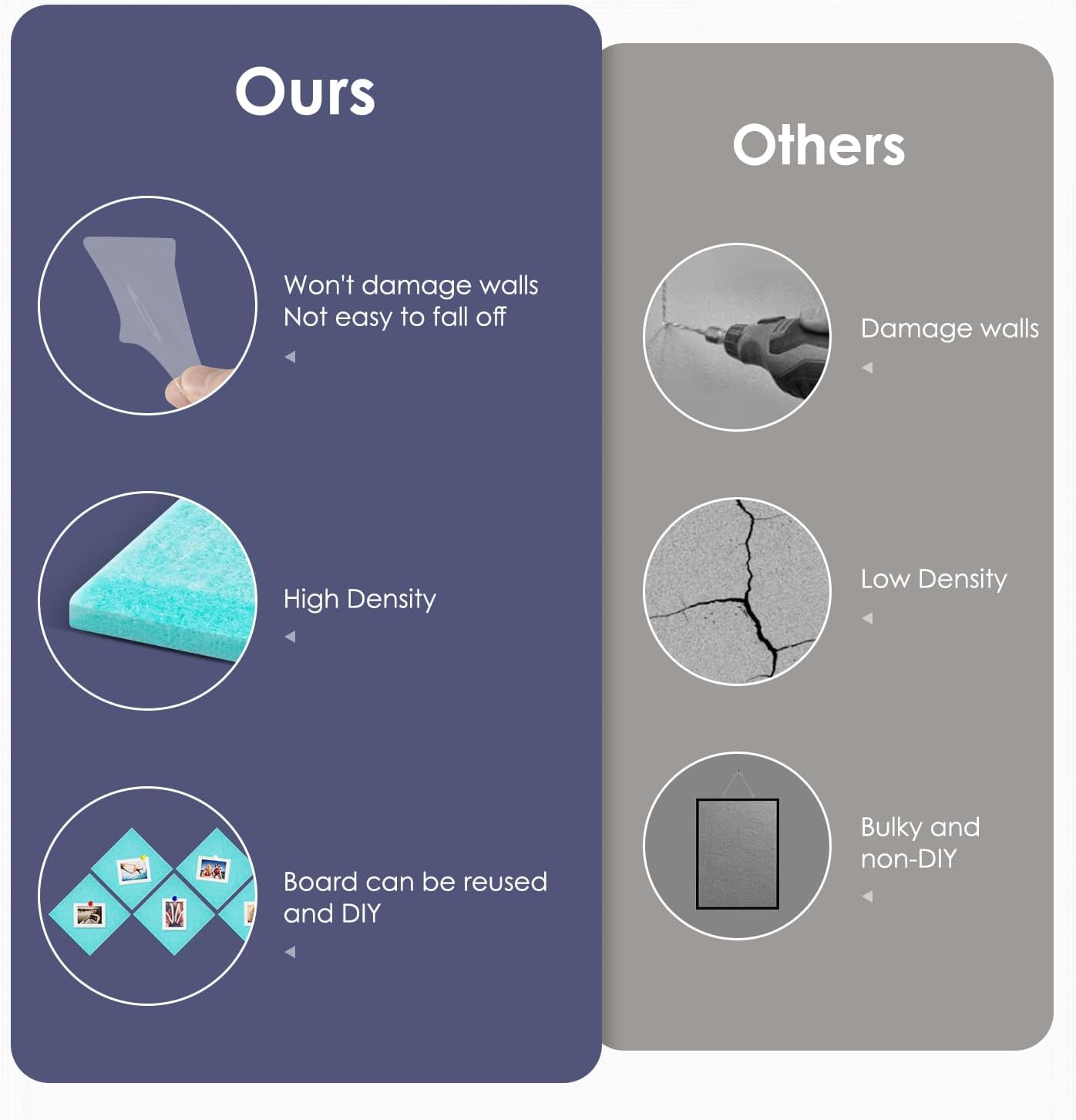 - 【Easy to remove, Repeated use】Communication board does not require drilling and nailing, and the cork board can be quickly installed within 5 minutes. Acrylic adhesives have strong adhesion to hold the panels from falling off from walls, meanwhile, pin boards are safe to be removed without leaving any adhesive residue or damaging your wall paint. Even when moving or redecorating, the wall remains as good as new. The pushpins will not pierce the bulletin board, protecting the wall and safe to use. Unlike a felt board that uses nails as a whole, once a vision board is fixed, tools are needed for disassembly, and it also damages the wall surface.