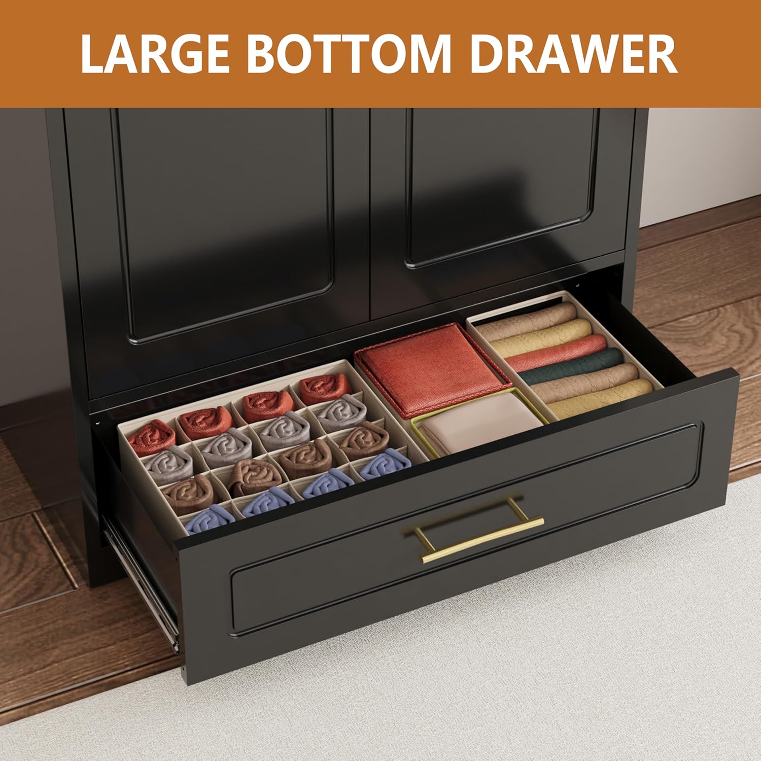 - [STURDY AND RELIABLE] Crafted from thickened steel panel, this black wardrobe with drawer stands firm and stable. Its robust clothing hanging pole can withstand up to 66LBS loding-bearing, ensuring years of reliable use. Reinforced joints and thick metal panels guarantee no wobbling or collapsing, even when fully loaded with lots of clothes
