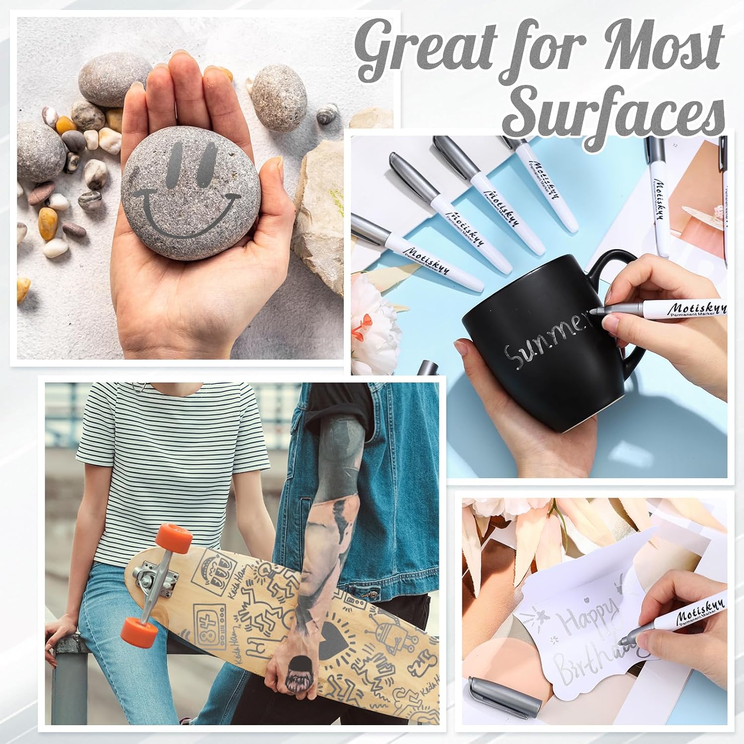 - Multi-surface Use: metallic marker pens do not need to be shaken, saving physical effort, and can be applied on a variety of surfaces, including paper, wood, fabric, canvas, stone, ceramic, plastic, metal, etc