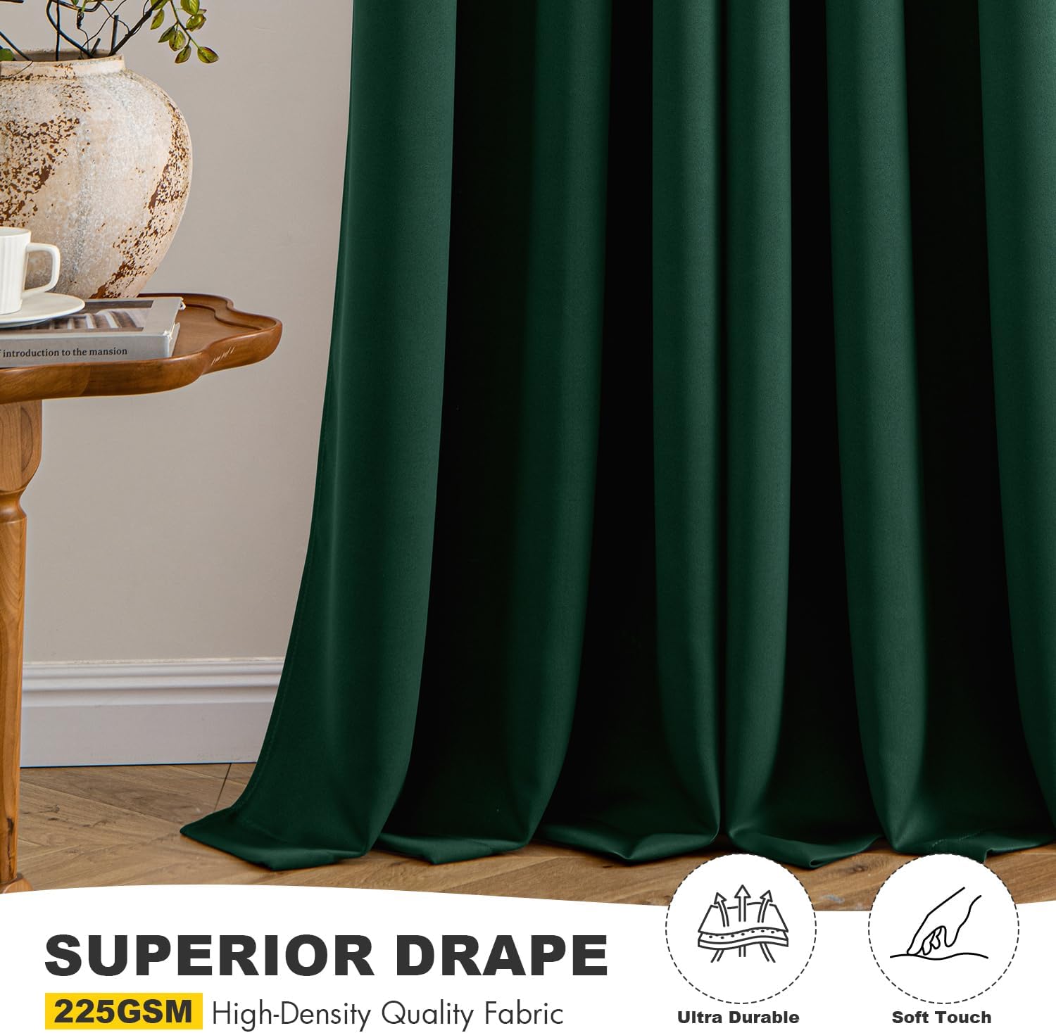- High-Quality Material: Crafted from high-quality 225GSM polyester fabric, these curtains offer enhanced durability and elegant drape. The soft blackout material features triple-layer weaving technology, with a middle layer of black yarn for superior light blocking and privacy. Both sides feature the same refined color, ensuring a seamless look that elevates your home’s aesthetic with understated sophistication