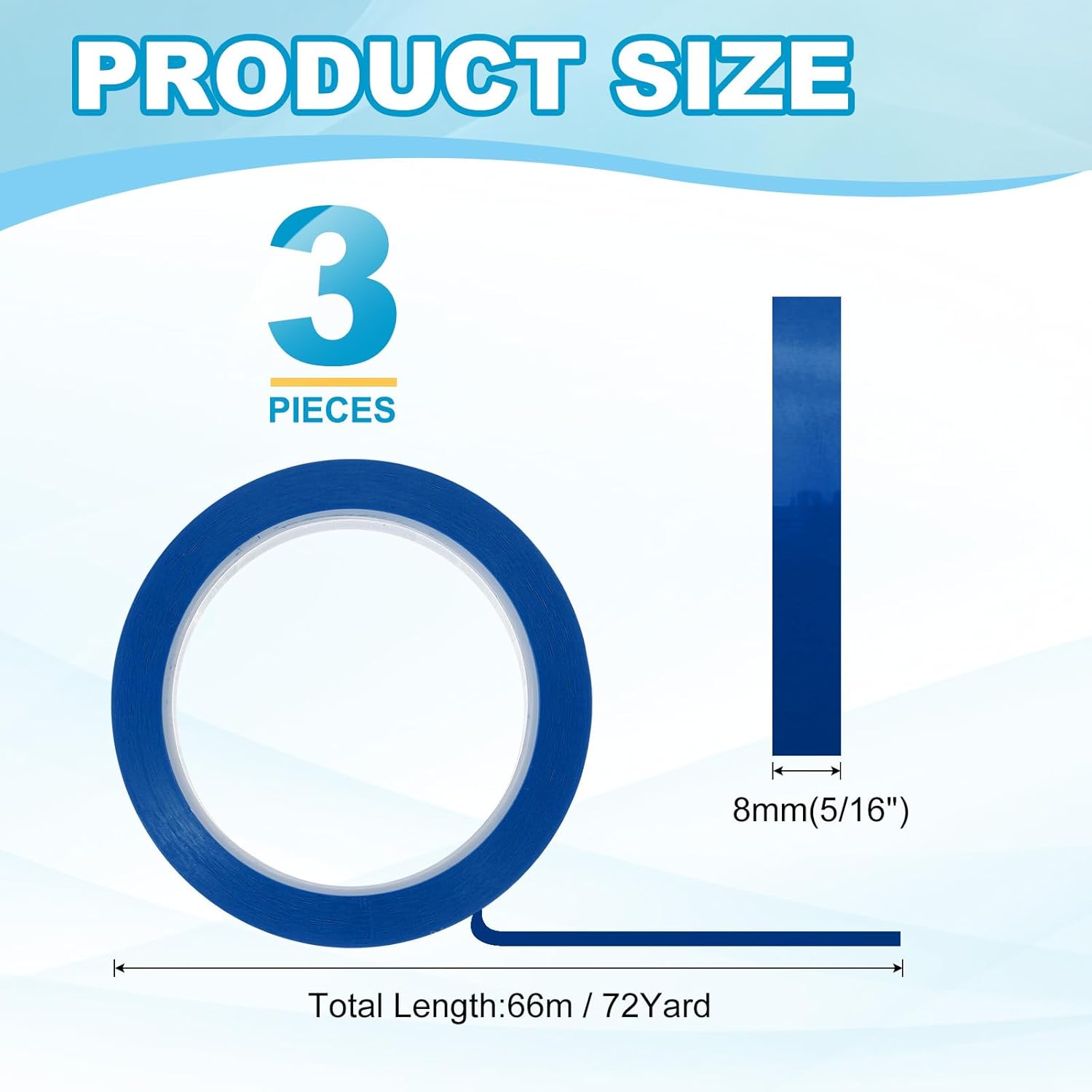 - This pinstripe tape provide here is in the size of: Width: 8mm(5/16"), Length: 66m(72 Yard); In the package of: 3 x Chart Line Tape