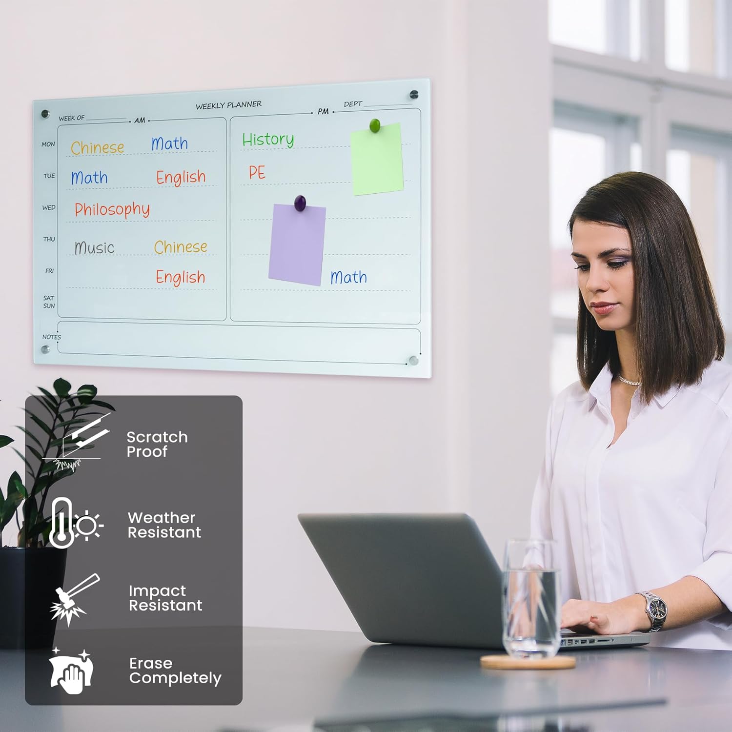 - Organized whiteboard: Helps manage tasks, schedules, and goals with monthly/weekly layouts and a dedicated notes/reminders section.
