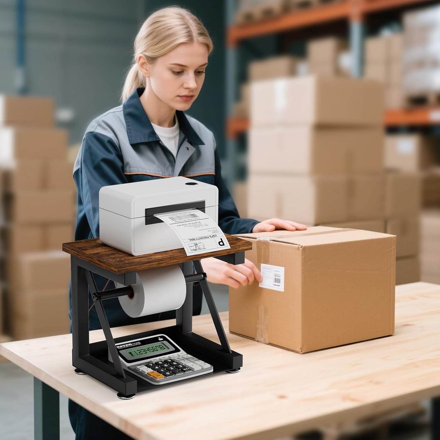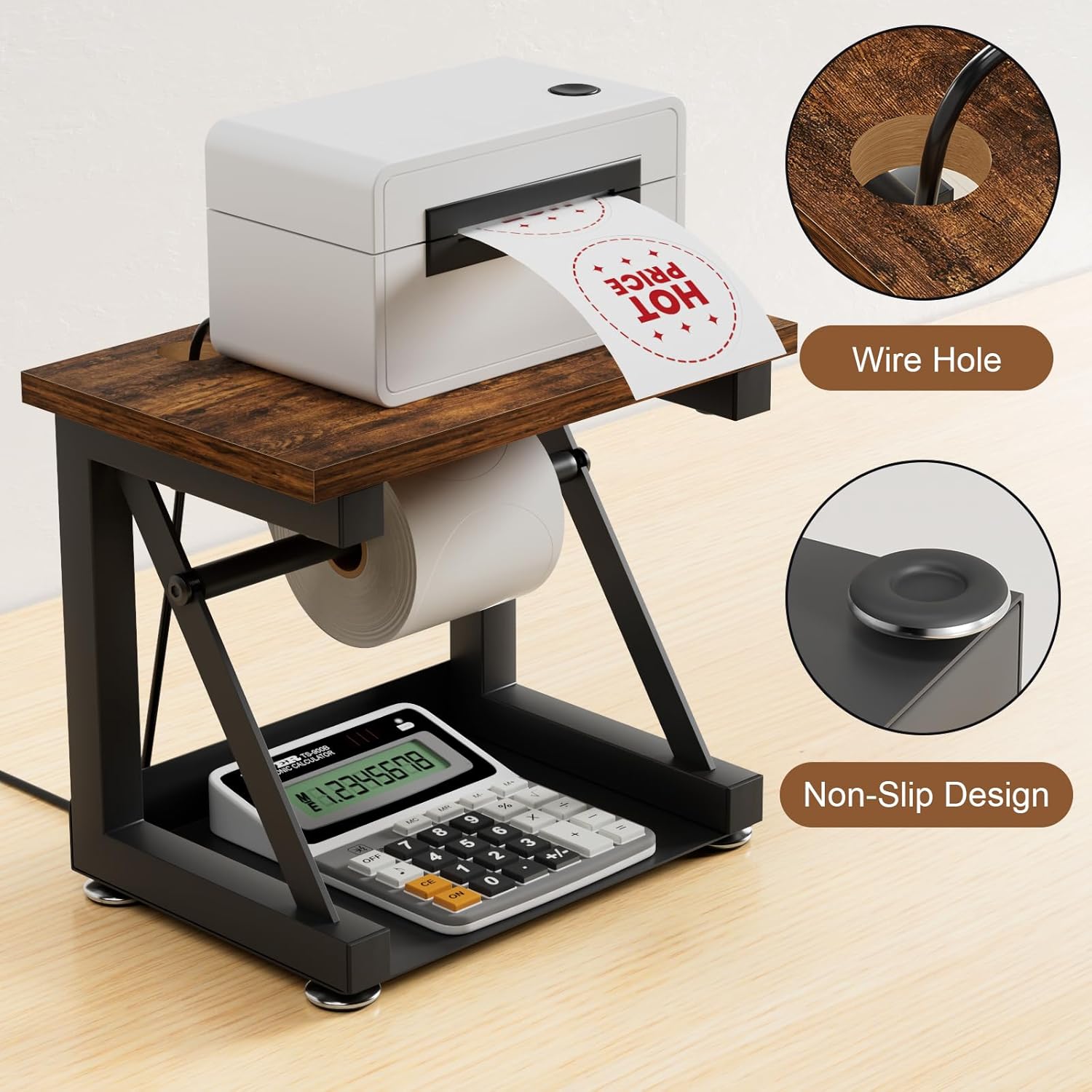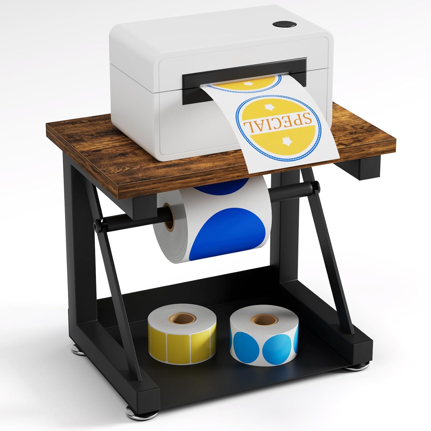 - 【Sturdy Construction】Our rollo label holder is constructed with matte black metal frame and high-quality wood, with better load bearing capacity, with anti slip foot pads at the bottom. The pole can be freely adjusted for tightness. Thermal printer stands providing you with a smooth printing label experience