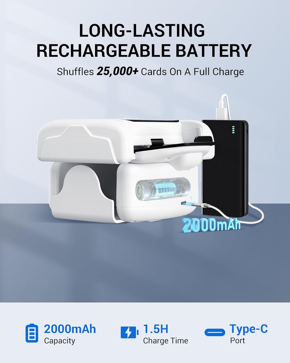 - Rechargeable & Long-Lasting Battery Life: Built-in rechargeable battery—no need to constantly replace batteries. This rechargeable card shuffler fully charges in just 1.5 hours via Type-C, and shuffles over 25,000 cards on a single charge. Supports charging while in use for uninterrupted fun