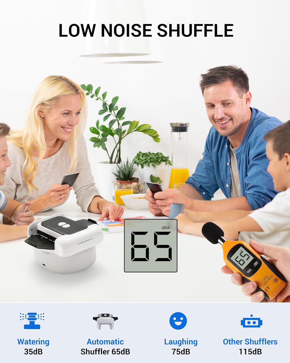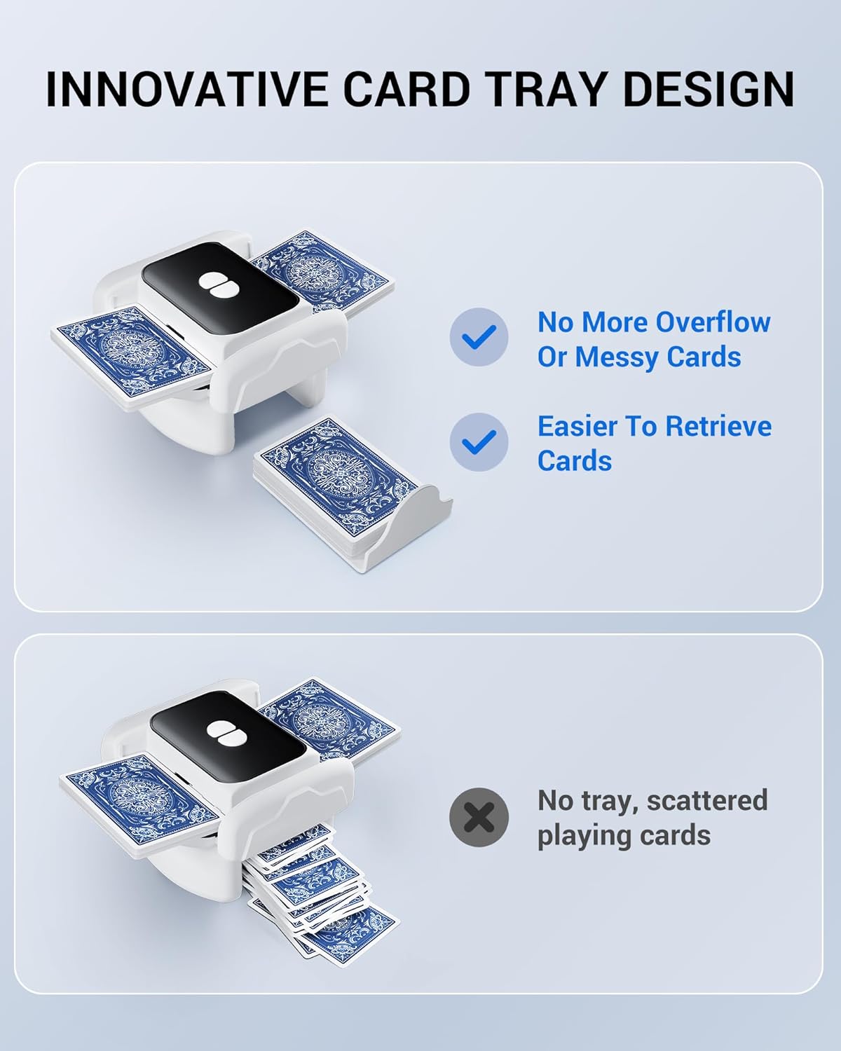 - No More Mess – Innovative Card Tray Design: The upgraded card tray of this card shuffling machine neatly collects shuffled cards without overflow or clutter. Easily retrieve your deck after shuffling—tidy, efficient, and game-ready