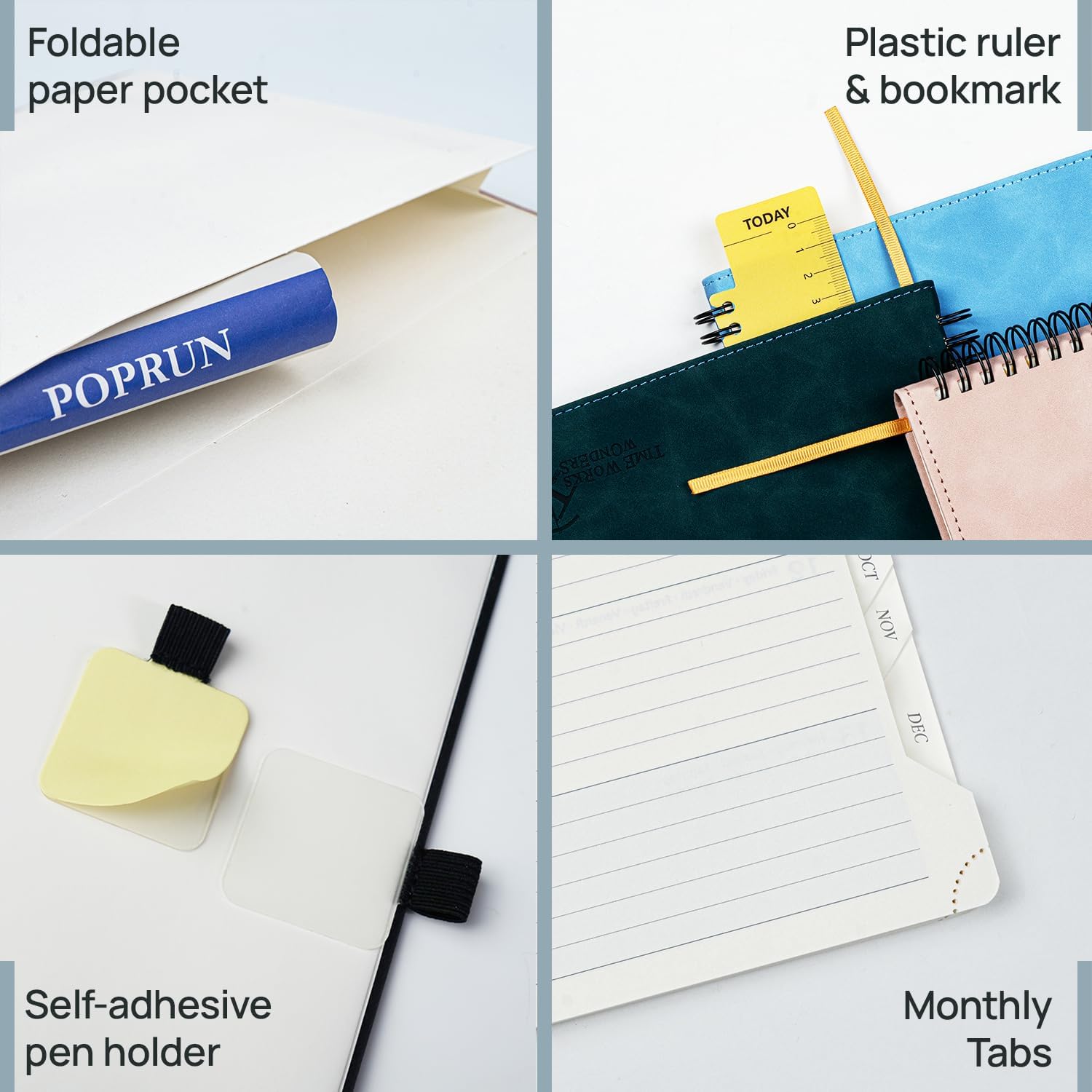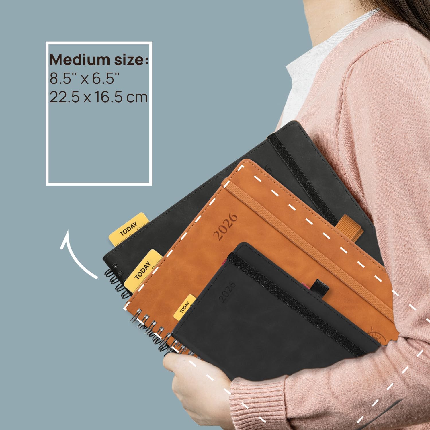 POPRUN 2026 Planner Weekly Notebook (Jan-Dec), Medium 8.5''x 6.5'' - Agenda 2026 Calendar Book with Monthly Tabs, Inner Pocket, Spiral Soft Cover, 100 GSM - Black