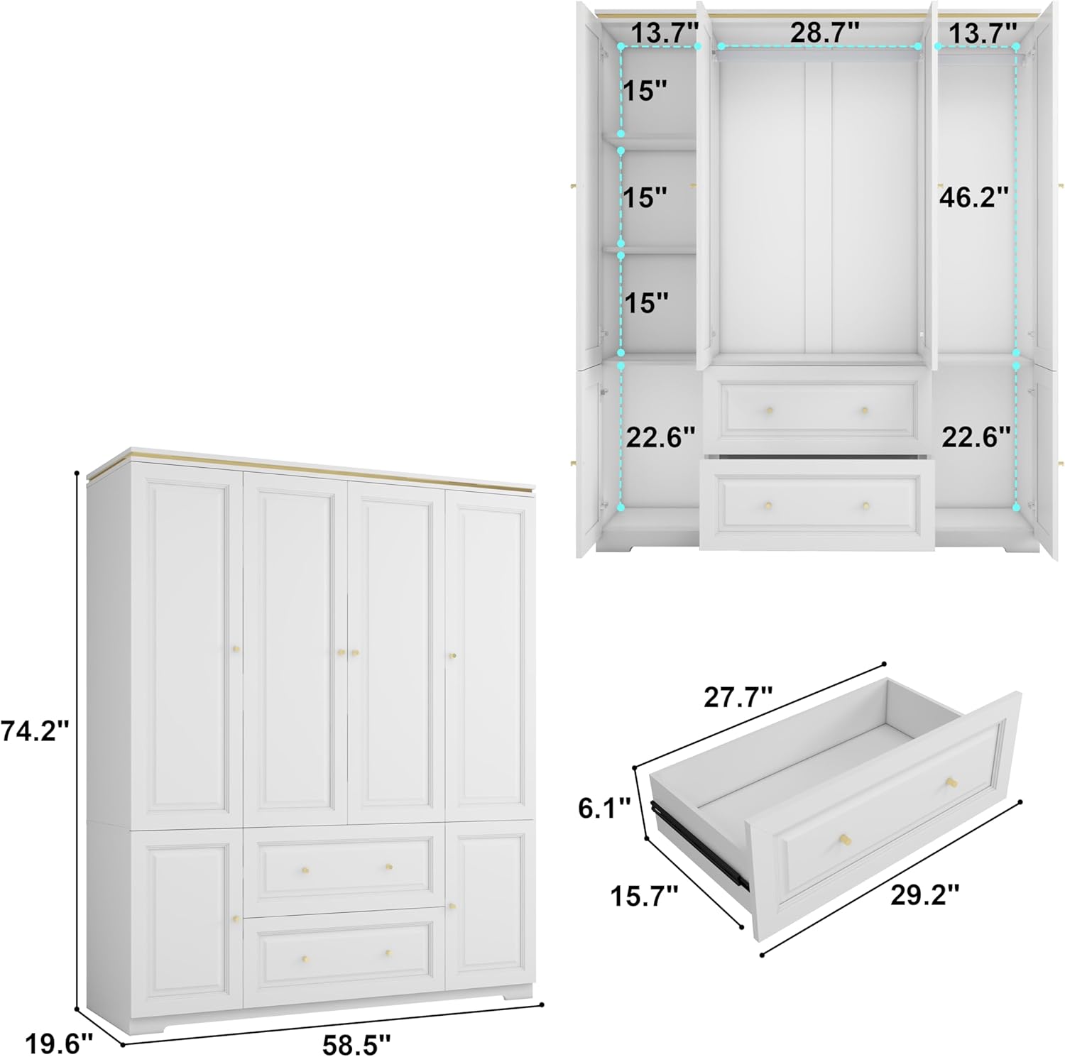 - Perfect Size: The white wardrobe closet with drawers measures W58.66"*D20.43"*H74.21", spacious yet space-efficient, making it especially ideal for medium to small-sized homes. It offers maximum storage capacity within limited space. The closet cabinets with doors and shelves has top space for placing luggage, storage boxes, and other seasonal items, effectively utilizing vertical space. It’s a great helper for expanding storage in the home.