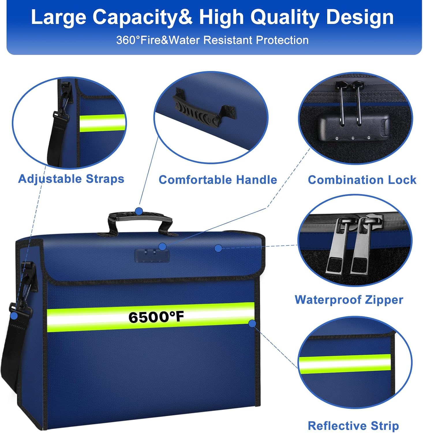 - ✅EXTRA LARGE CAPACITY. Extra large interior dimensions (16.5x12.4x5.5 inches) accommodate the largest binders and provide space for laptops, valuables, and more. Our unique U-shaped zipper closure maximizes open space for easy access to items, while the straight zipper fireproof pocket limits loading. The interior zipper pocket allows you to safely store small items such as passports, cash, and jewelry.