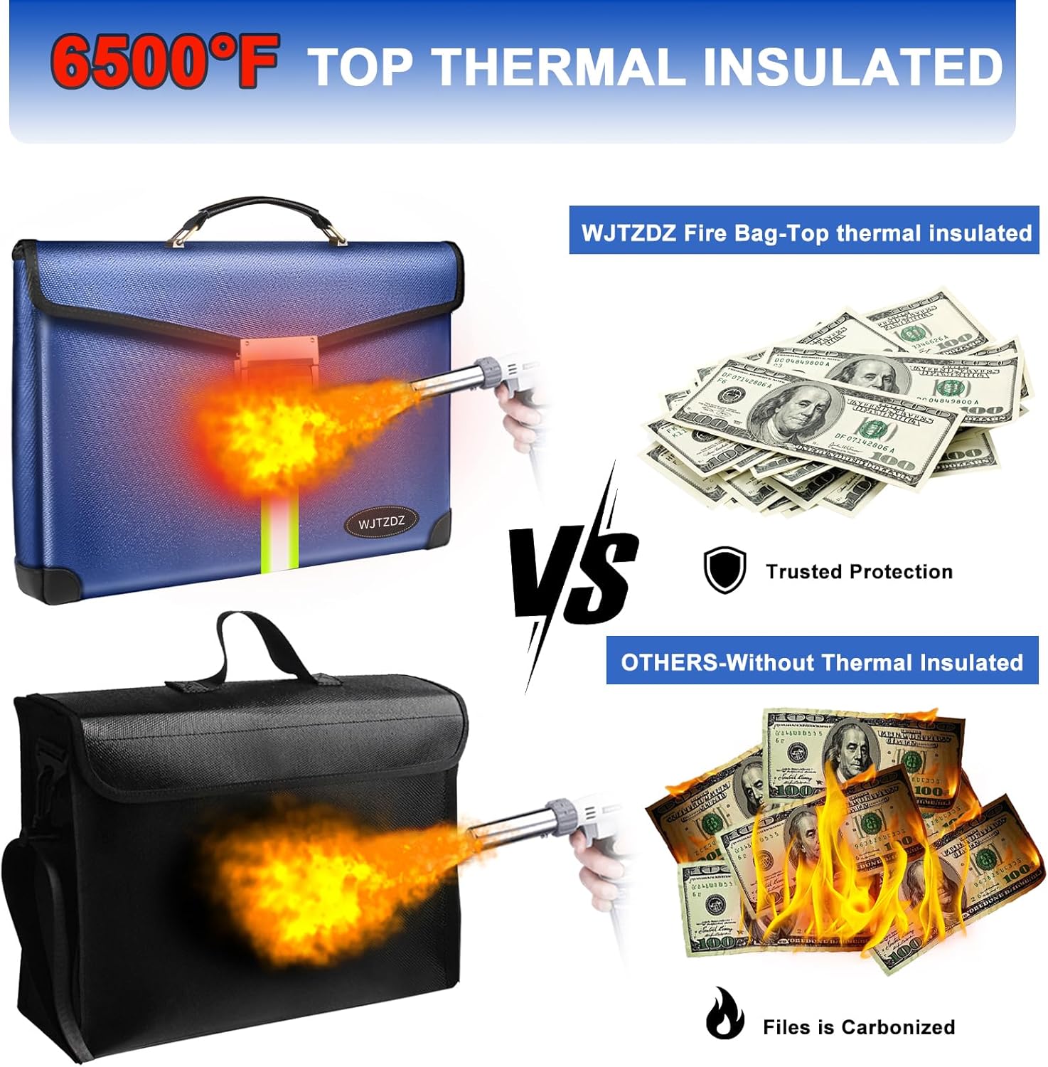 - ⚠️(Note) Fireproof does not mean it can withstand a long fire, and waterproof does not mean it can be immersed in water for a long time.It just gives you enough time to rescue your valuables. 🔥【6500°F Top Fireproof】The upgraded fireproof bag has passed the global flammability standard (US laboratory) and vertical burning test (SGS UL94 V-1) and can withstand temperatures up to 6500°F, far exceeding the typical fire temperature.