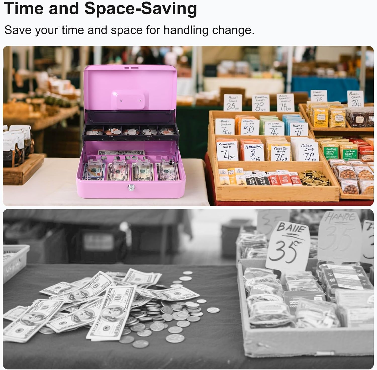 - Upgraded Design with Secure Coin Lid: This cash box has an improved design, featuring a special lid to keep your coins safely stored.No more worries about coins spilling or getting disorganized, even during movement.