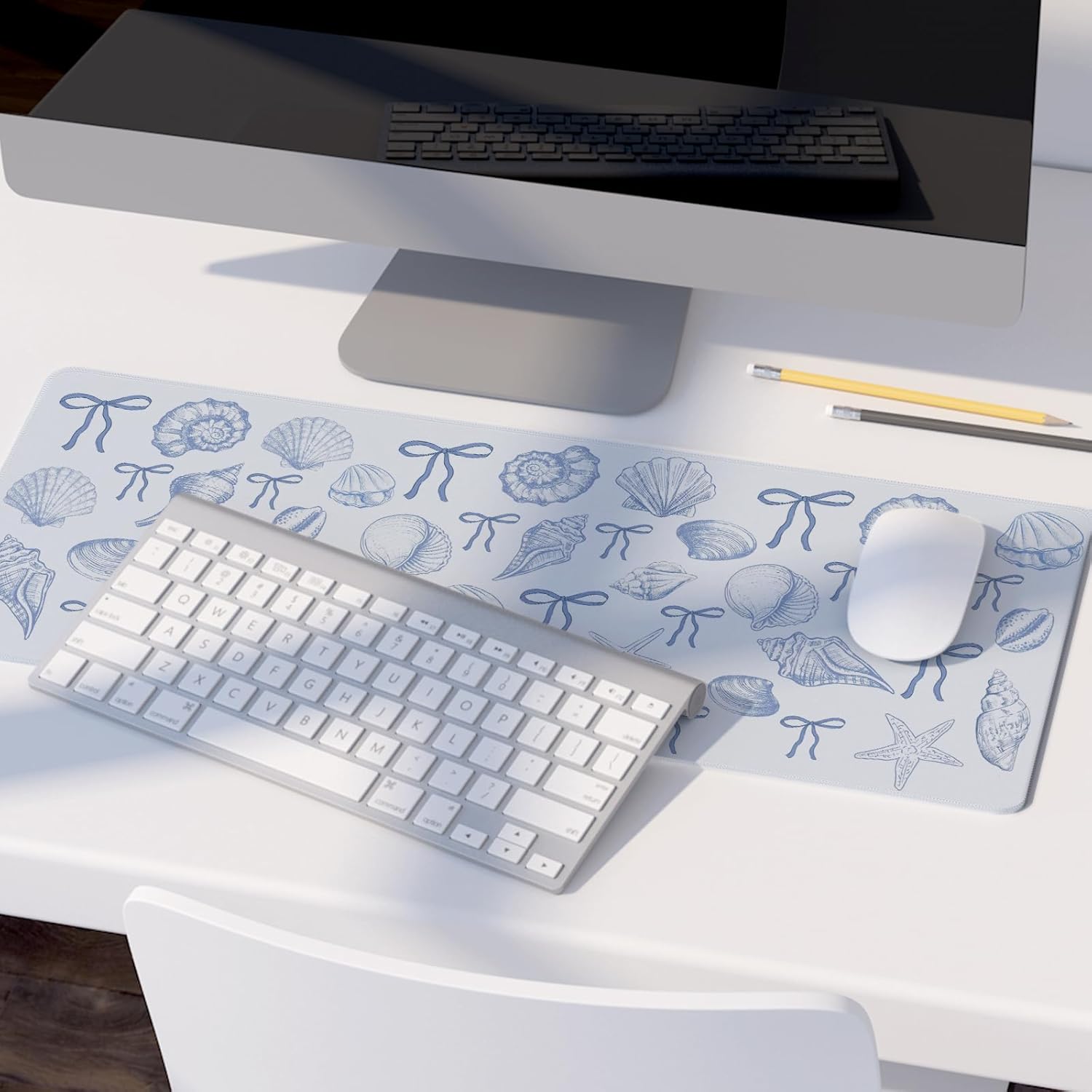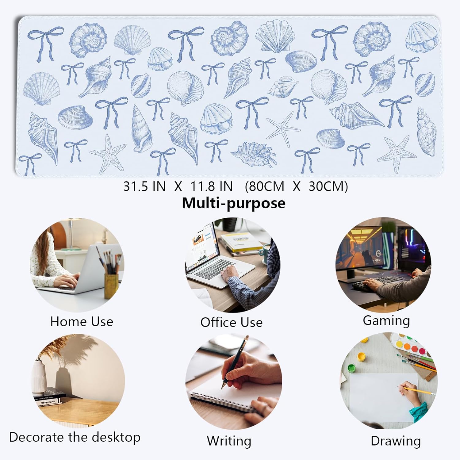 Blue and White Seashell Bow Mouse Pad,Coastal Beach Mouse Pad,XL Large Ocean Beach Seashell Desk Mat,Girly Vintage Summer Beachy Gaming Pads,Girly Summer Desktop Decor Art,31.5x11.8In