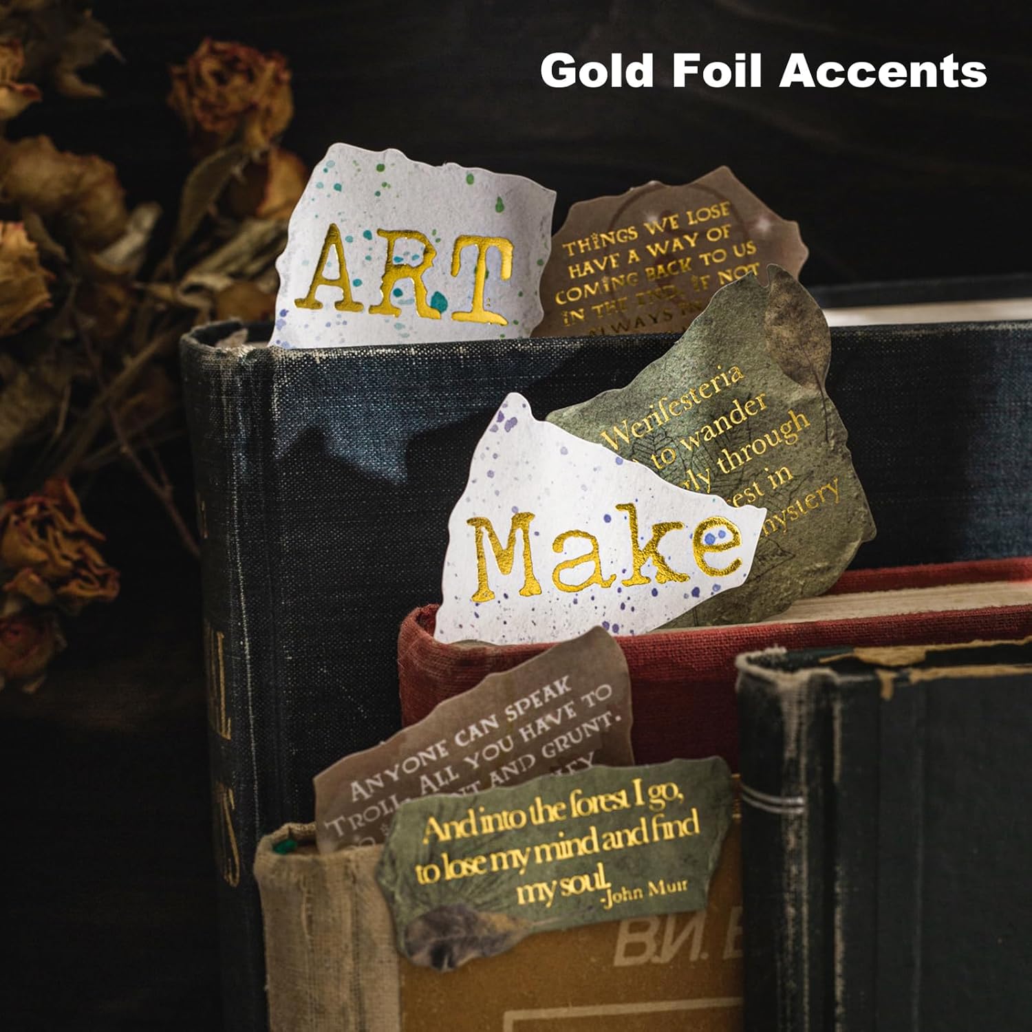 - Selective Gold Foil Details: Some designs feature subtle gold foil accents that enhance the vintage feel without overwhelming. The textured lettering brings a refined, aged book aesthetic to your creative work