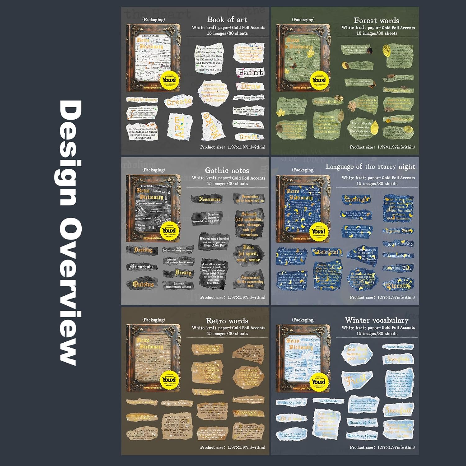 - Vintage Literary Designs: This collection features 180 vintage English stickers across 6 styles, each with 15 unique designs (30Pcs). With irregular torn edges and antique fonts, these 1.97×1.97in stickers add a nostalgic literary flair to any creative project