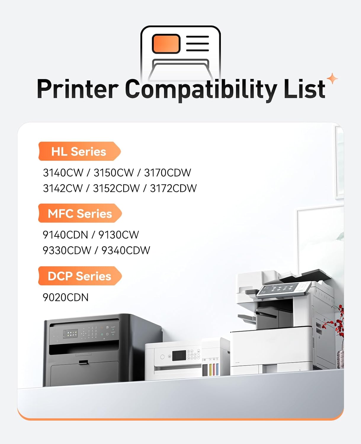 - Compatible Printers: Compatible with Brother DCP Printer Series:DCP-9020CDN. HL Printer Series:HL-3140CW, HL-3150CW, HL-3170CDW, HL-3142CW, HL-3152CDW, HL-3172CDW. MFC Printer Series:MFC-9140CDN, MFC-9130CW, MFC-9330CDW, MFC-9340CDW.