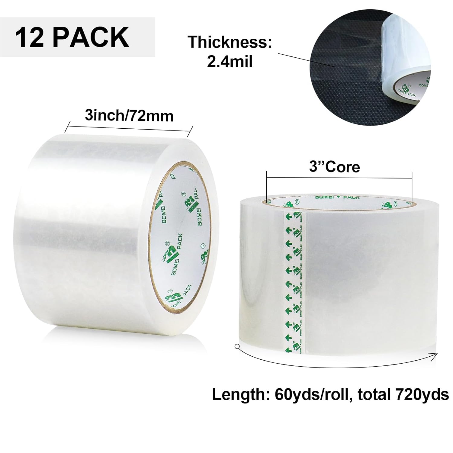BOMEI PACK 3 inch Wide Heavy Duty Packing Tape, 2.4 Mil 3.0 Inch x 60 Yards, 12 Refills Rolls Clear Box Tape for Moving, Shipping, Mailing and Packaging