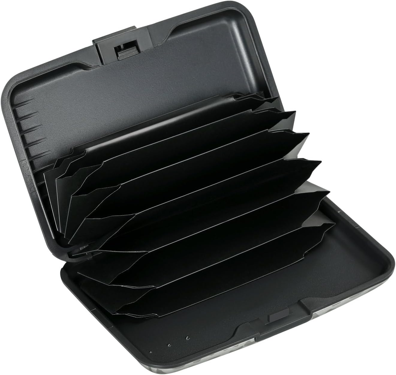 - This credit card holder is made of aluminum shells, ABS plastic frame and clasp closure, RFID-blocking will protect your card data from RFID scanners and readers.