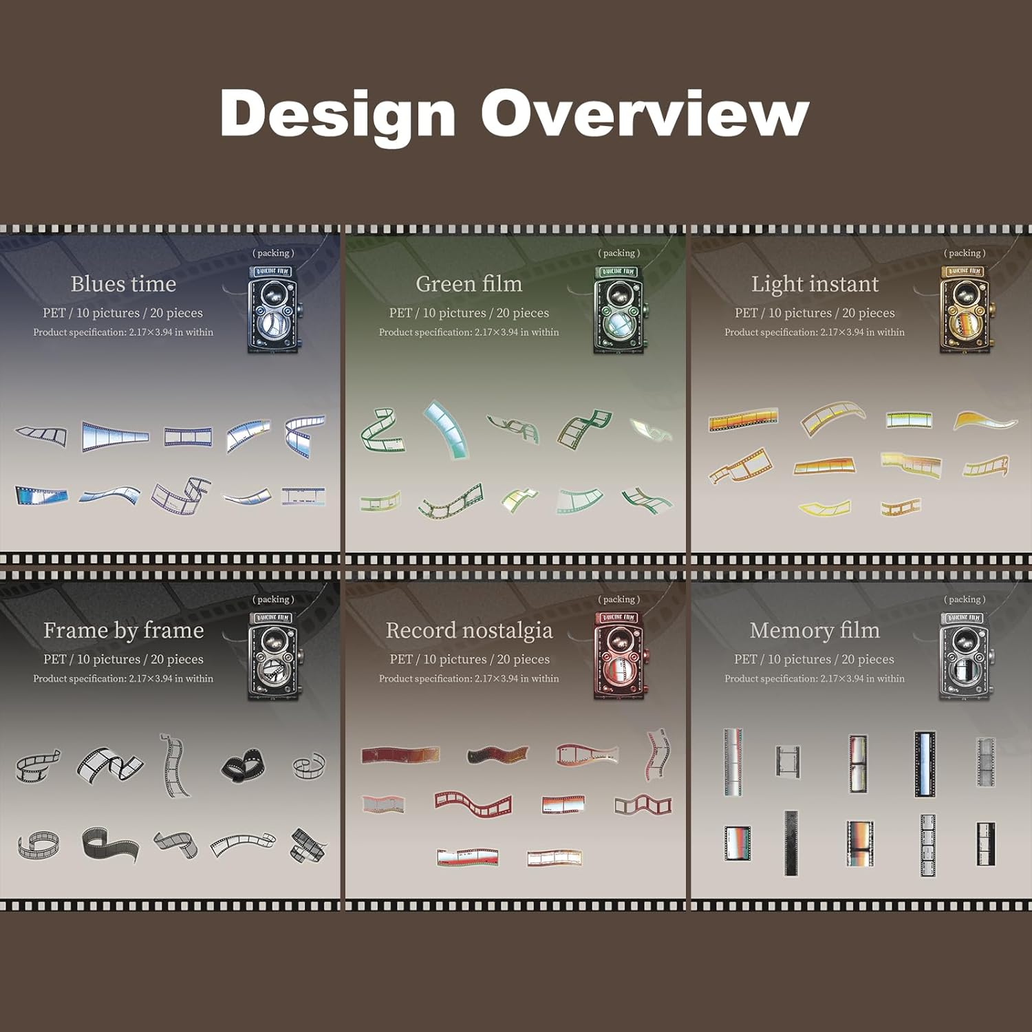 - Vintage Film-Themed Variety: Includes 6 styles, each with 10 unique designs and 20 pieces per style, totaling 120 stickers featuring vintage film reels, classic frames, and cinematic elements that bring a nostalgic and artistic vibe to your projects
