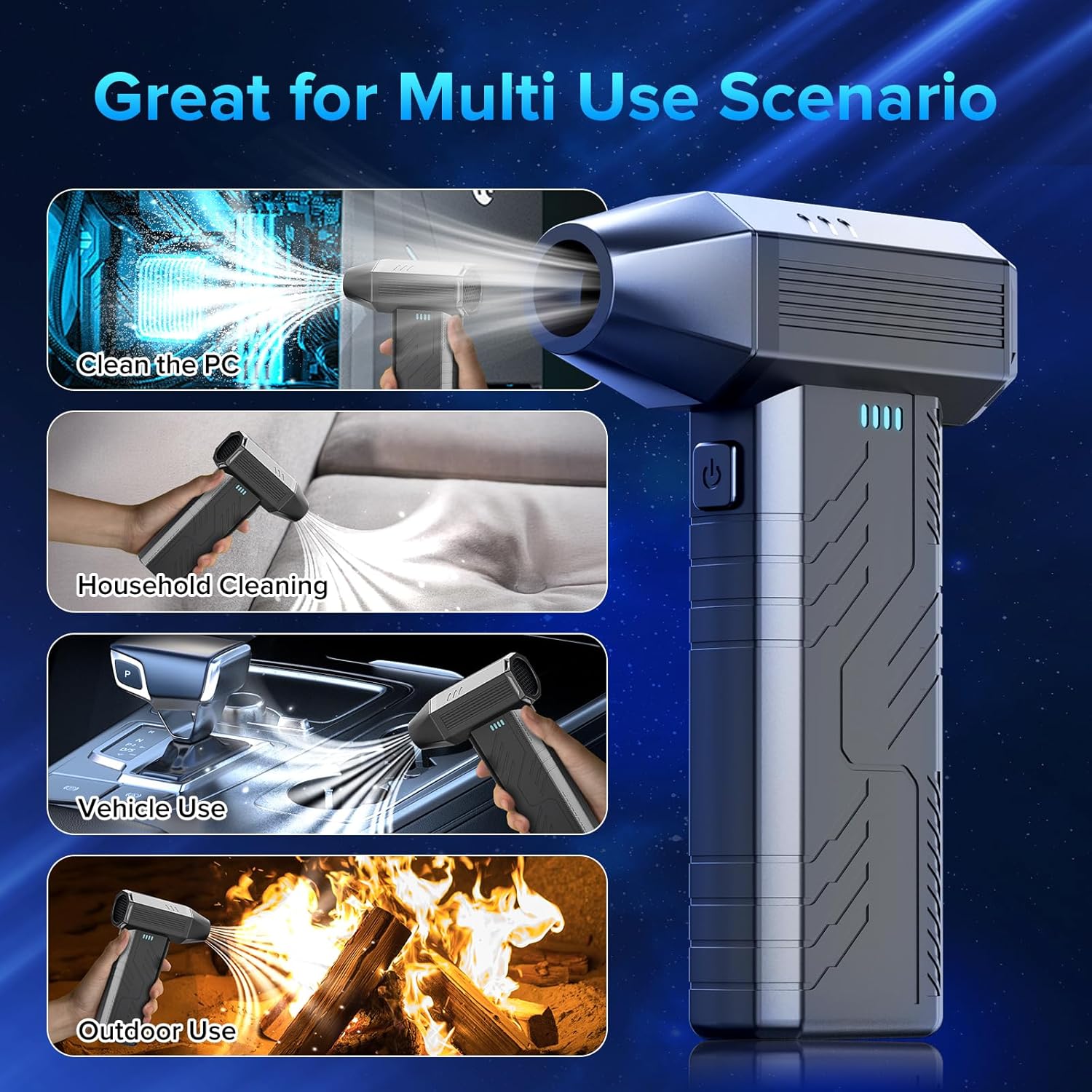 - Multiple Usage Scenarios: Our PC Cleaning kit is equipped with 5 nozzles and 2 brushes, great suitable for many scens, such as keyboard cleaning kit, electric leaf blower, car detailing supplies, pc duster, snow blower, turbo fan, car dryer, air broom, camera cleaner and so on. The diversification nozzles allow you to use for outdoor picnics to blow fires, clean pet hair, inflate swimming rings, yoga balls, air mattresses, etc.
